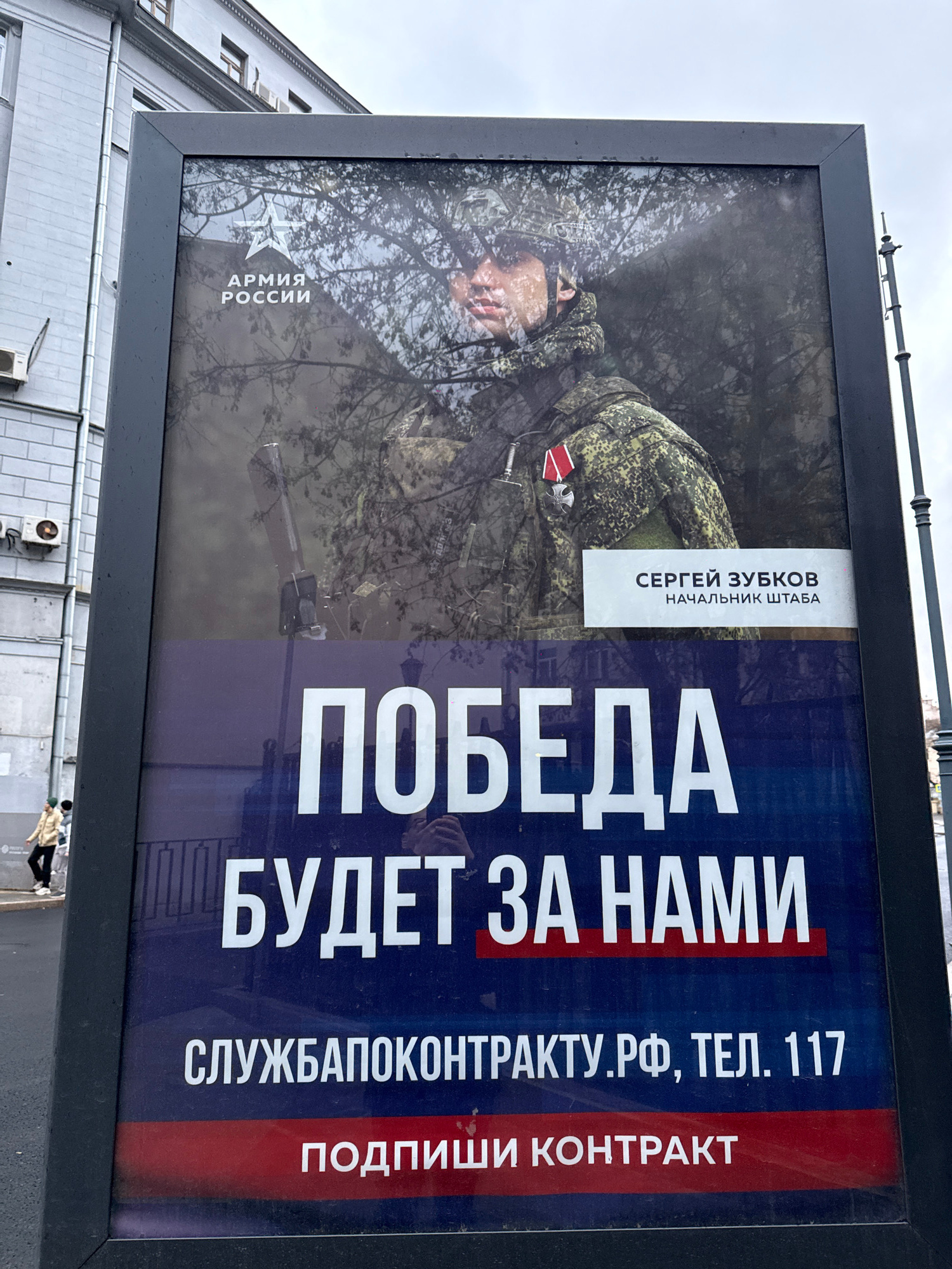 The image displays a large, vertically oriented billboard, captured from a low angle and appearing somewhat tilted against an overcast sky in an urban setting, likely Moscow, Russia, given the context…read more