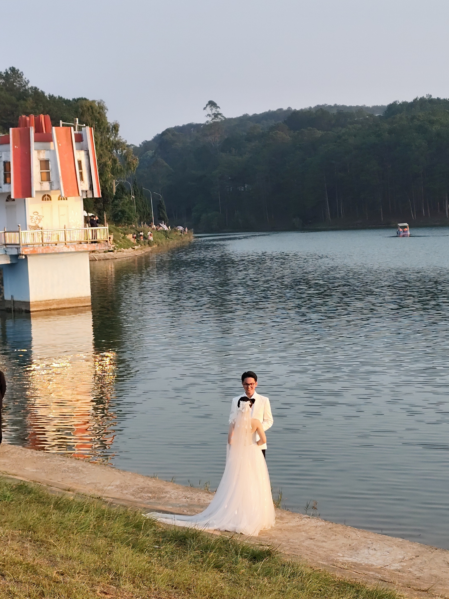 This image captures a wedding couple posing by the edge of Tuyen Lam Lake in Da Lat, Vietnam, during late afternoon. In the foreground, a man, identified as a groom, stands facing the camera on a grasβ¦read more