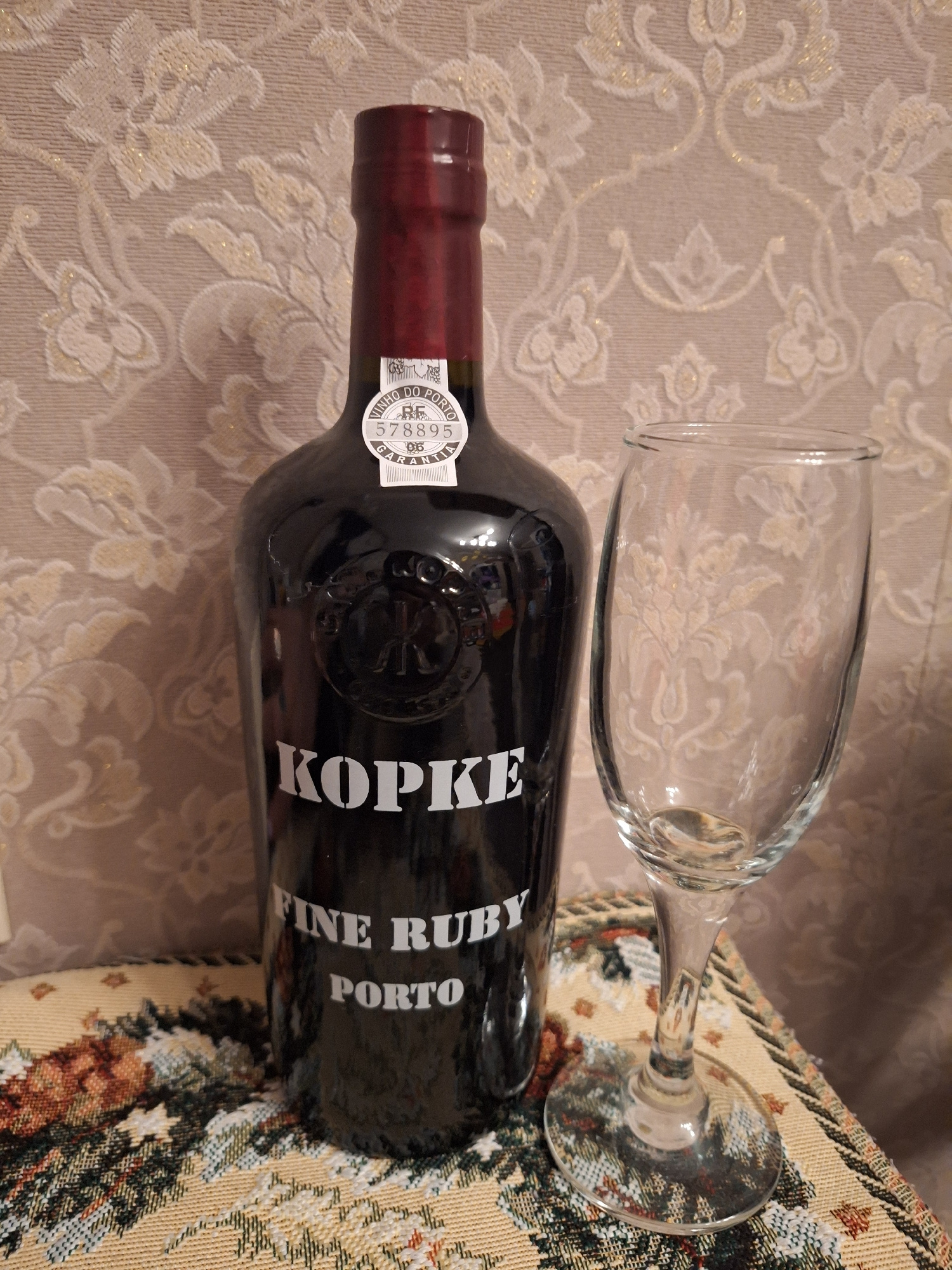The image displays a dark-colored wine bottle and an empty, clear wine glass laid horizontally on a patterned surface. The bottle is prominent, featuring a main label with the brand "KOPKE" in large w…read more