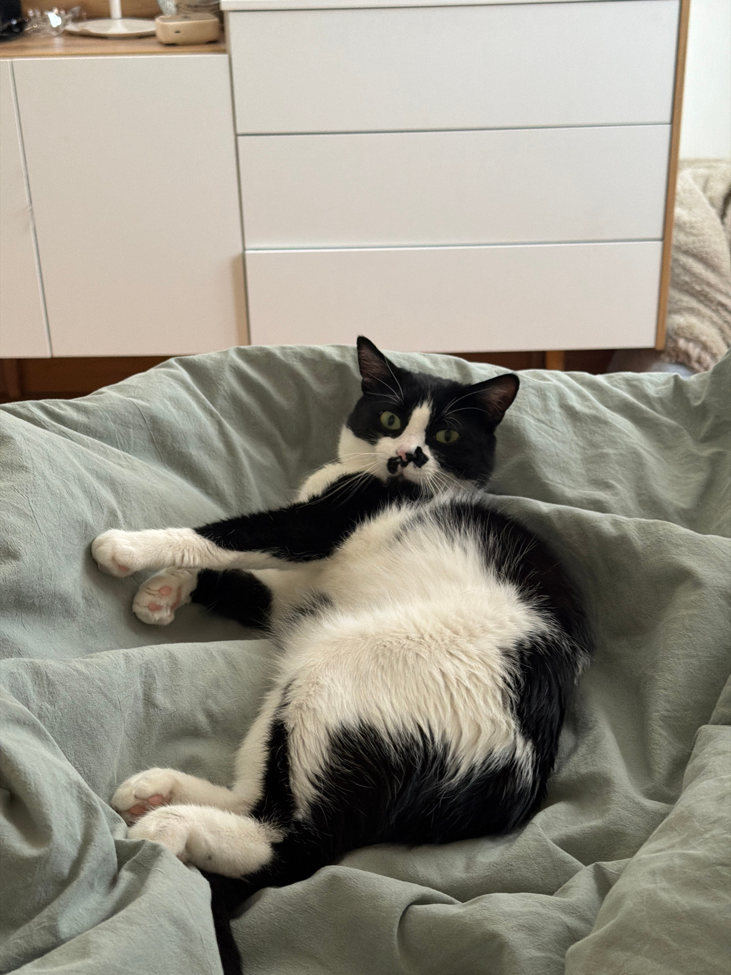 A black and white cat lies on a light green wrinkled sheet, possibly a bedcover. The cat faces the viewer with its head tilted, showing its face with a distinct black spot on its nose. The cat's paws…read more