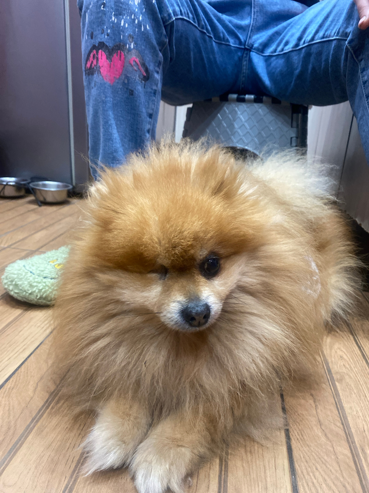 A Pomeranian dog lies on a wood floor. A person wearing blue jeans with a pink butterfly design sits to the left of the dog on a grey step stool. A green slipper sits near the dog. The location cannot…read more