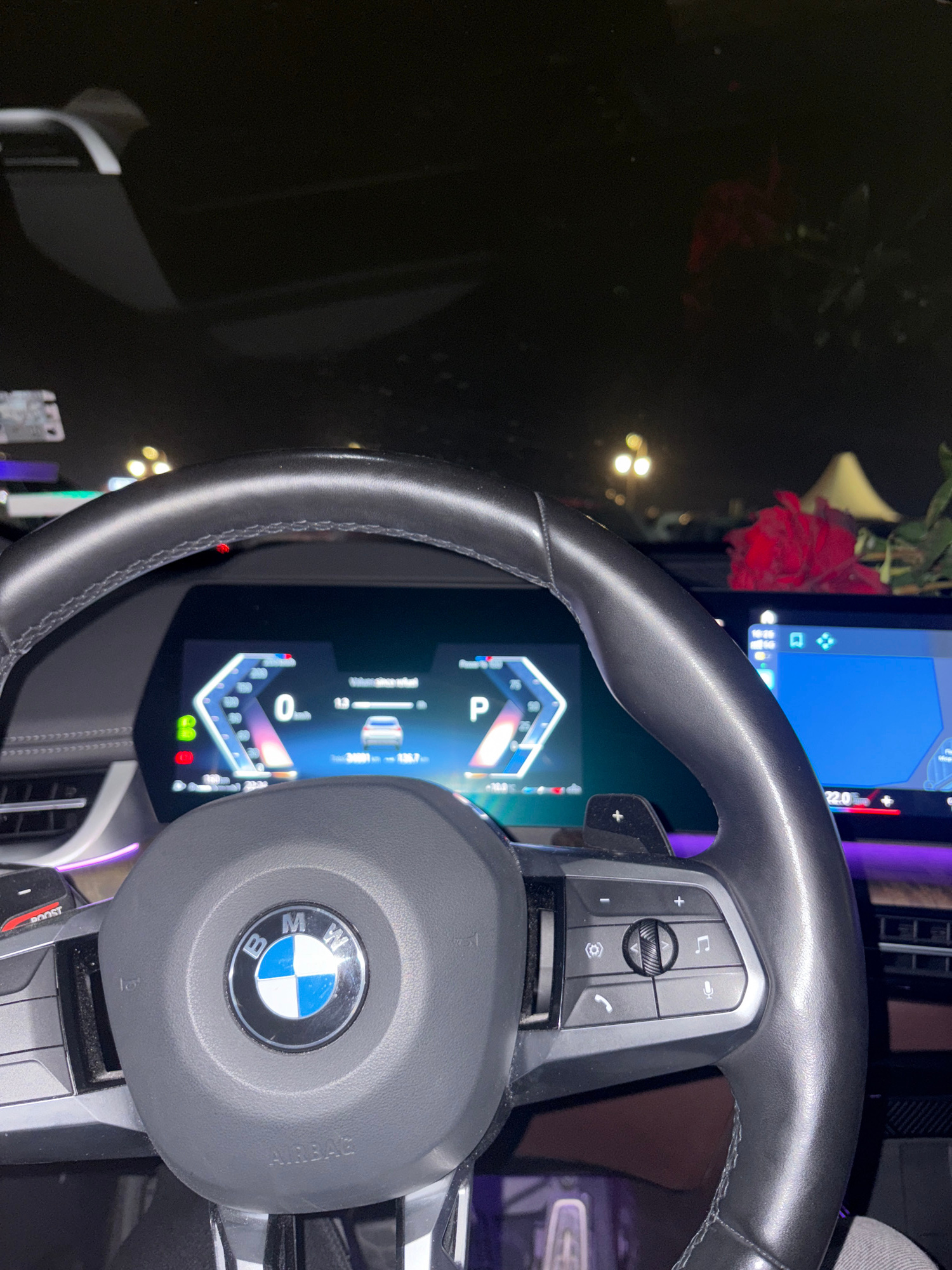 The image shows the interior of a BMW car, specifically the steering wheel and dashboard. The BMW logo is prominently displayed on the steering wheel. The digital dashboard screen is active, showing v…read more