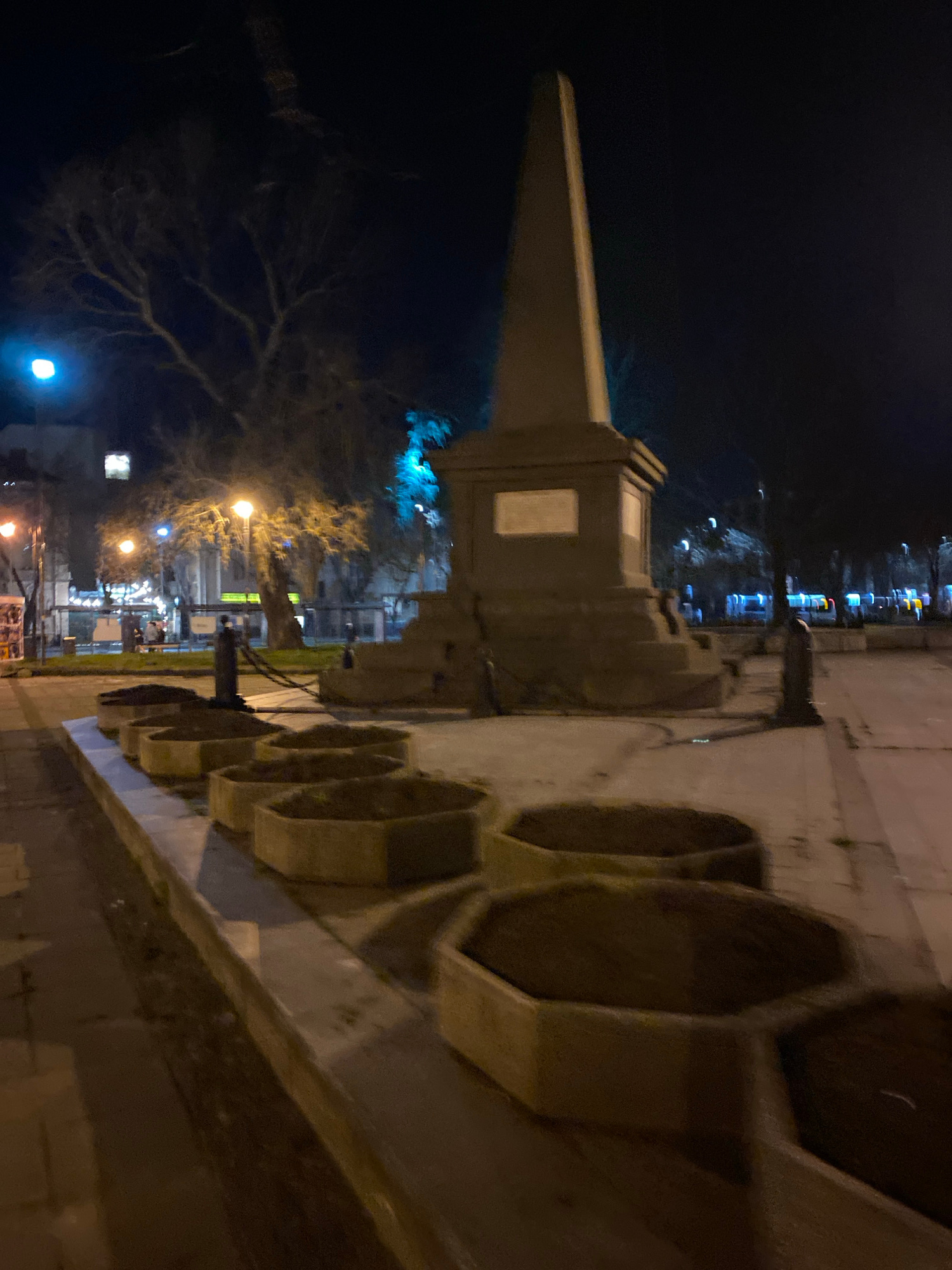 At night in Varna, Bulgaria, a dimly lit street scene focuses on a tall, stone obelisk monument in the foreground. Adjacent to the monument are hexagonal planters. In the background, blurred lights fr…read more