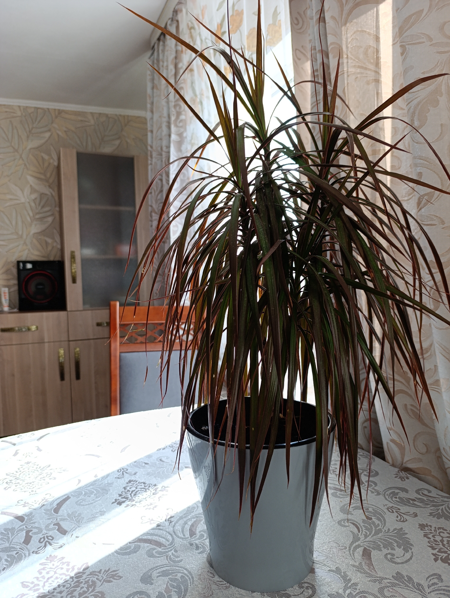 The image depicts an indoor scene with a potted Dracaena marginata plant as the primary subject. The plant is in a light gray pot and sits on a table covered with a white patterned tablecloth. The bac…read more
