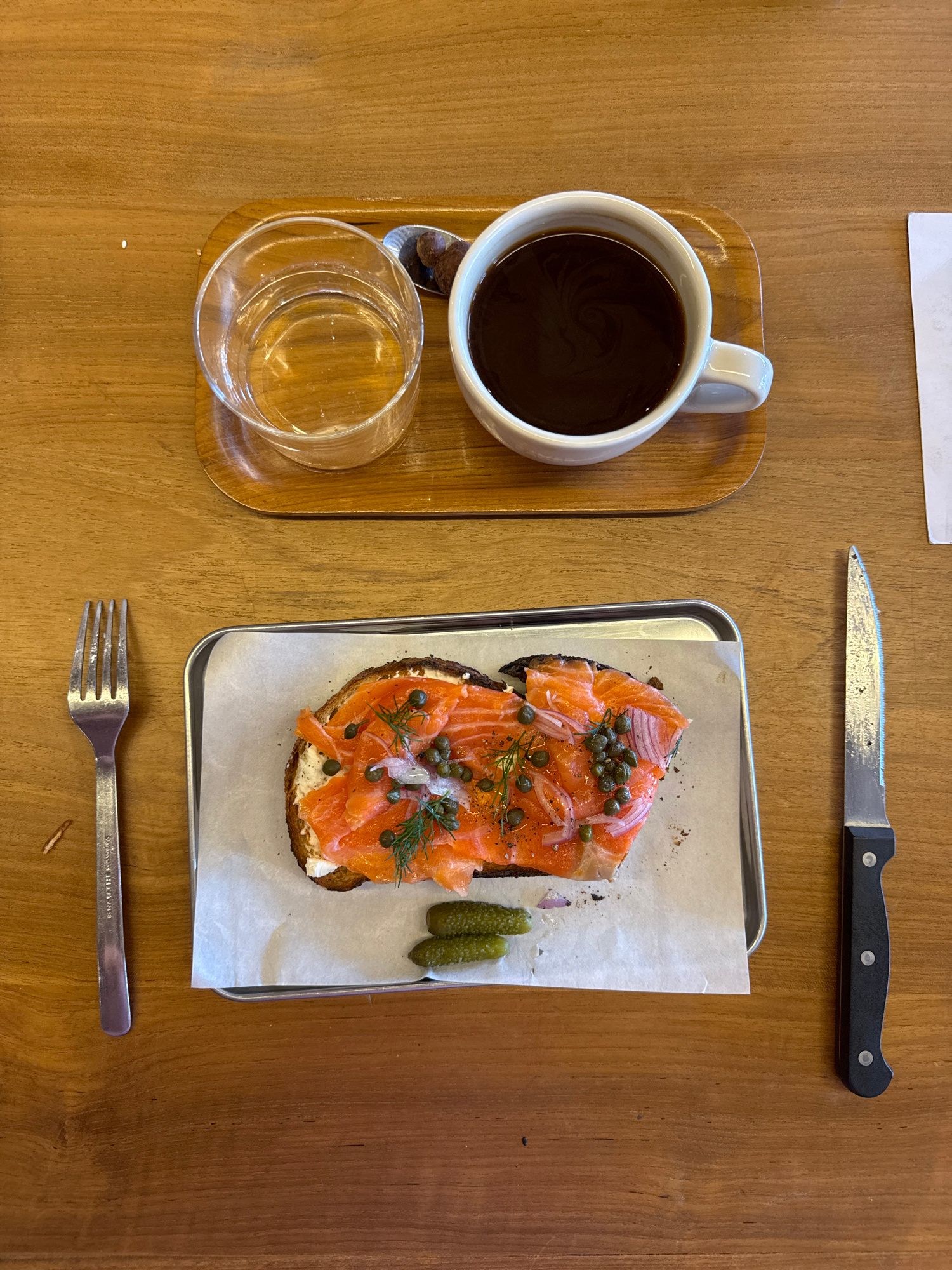 An overhead shot shows a wooden table setting with food and beverages. A wooden tray holds a white mug filled with dark coffee, a small spoon, and a clear glass of water. Next to the tray, a silver tray contains a slice of dark bread topped with cream cheese, smoked salmon, capers, and dill. Two small pickles lie beside the toast. A knife with a black handle is positioned above the silver tray, while a fork rests below. The scene suggests a cafe or restaurant setting, possibly for breakfast or brunch. The image does not provide sufficient information to confirm the location in North Kuta, Indonesia. | Open Wire