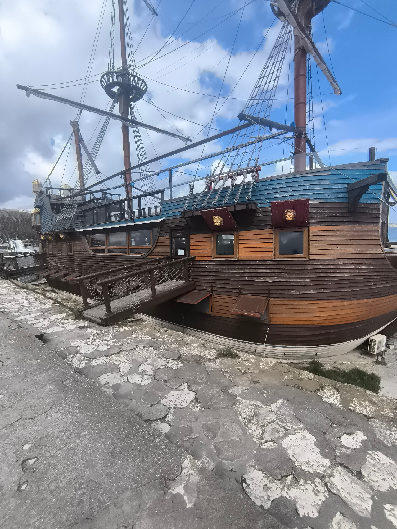 The image depicts a stationary wooden ship designed to resemble a pirate ship, located on a cracked, concrete dock. The hull is brown, with a blue upper section and two closed window shutters. The shi…read more