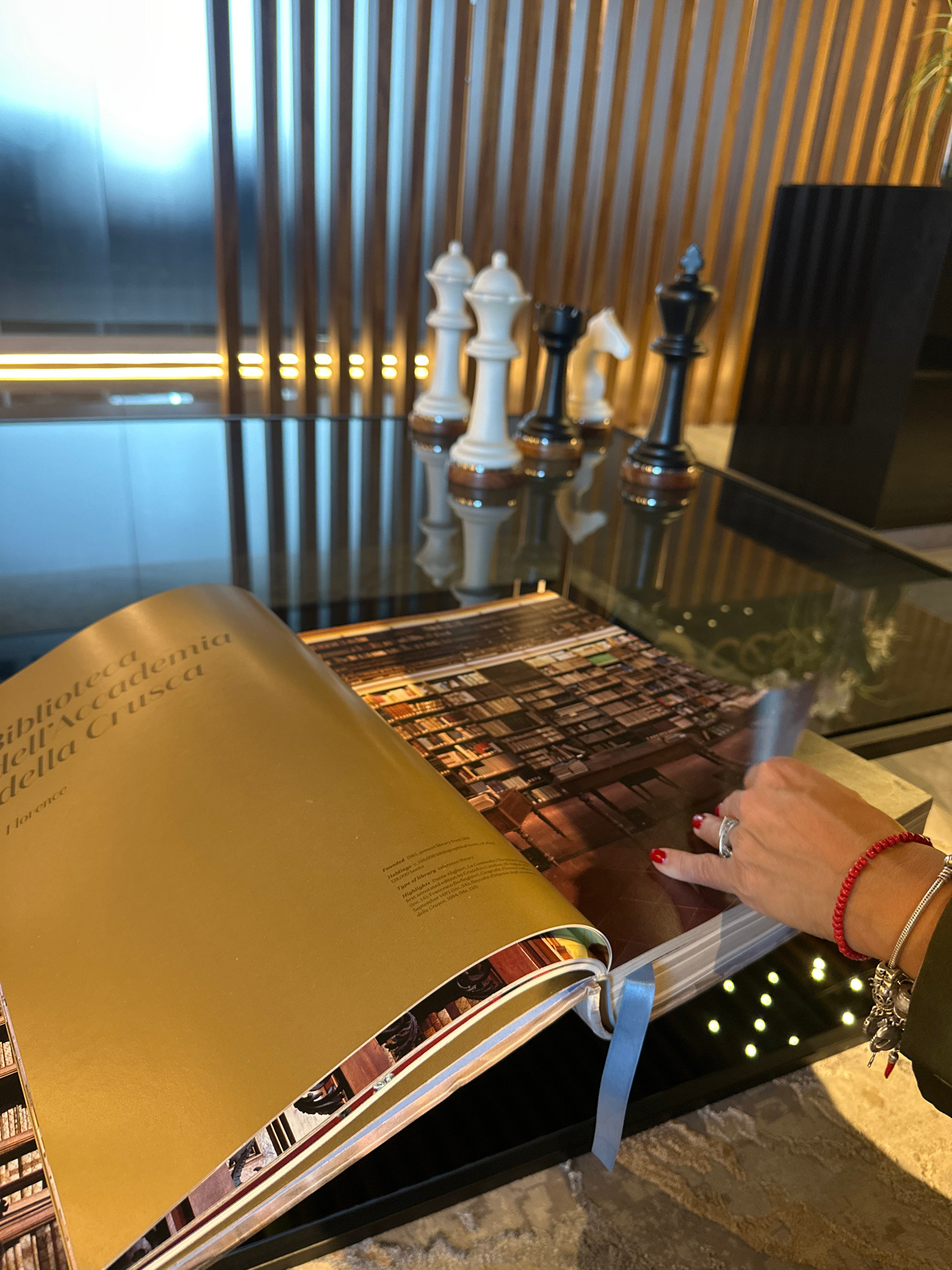 The image shows a partially opened book on a glossy surface, possibly a coffee table or counter, with a person's hand resting on the open page. The book has a gold-colored cover with the text "bibliot…read more