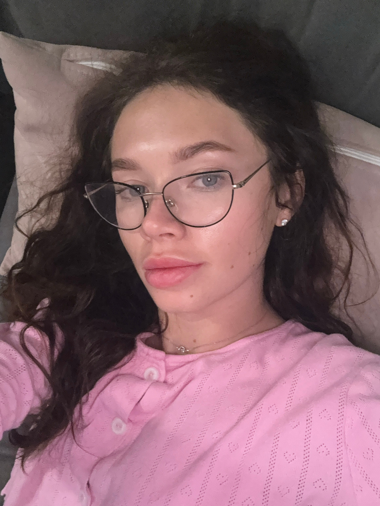 A woman is lying down, likely on a pillow or cushion. She is wearing eyeglasses with thin, black frames and a pink, buttoned shirt with a textured pattern. Her dark hair is loose and spread around her…read more