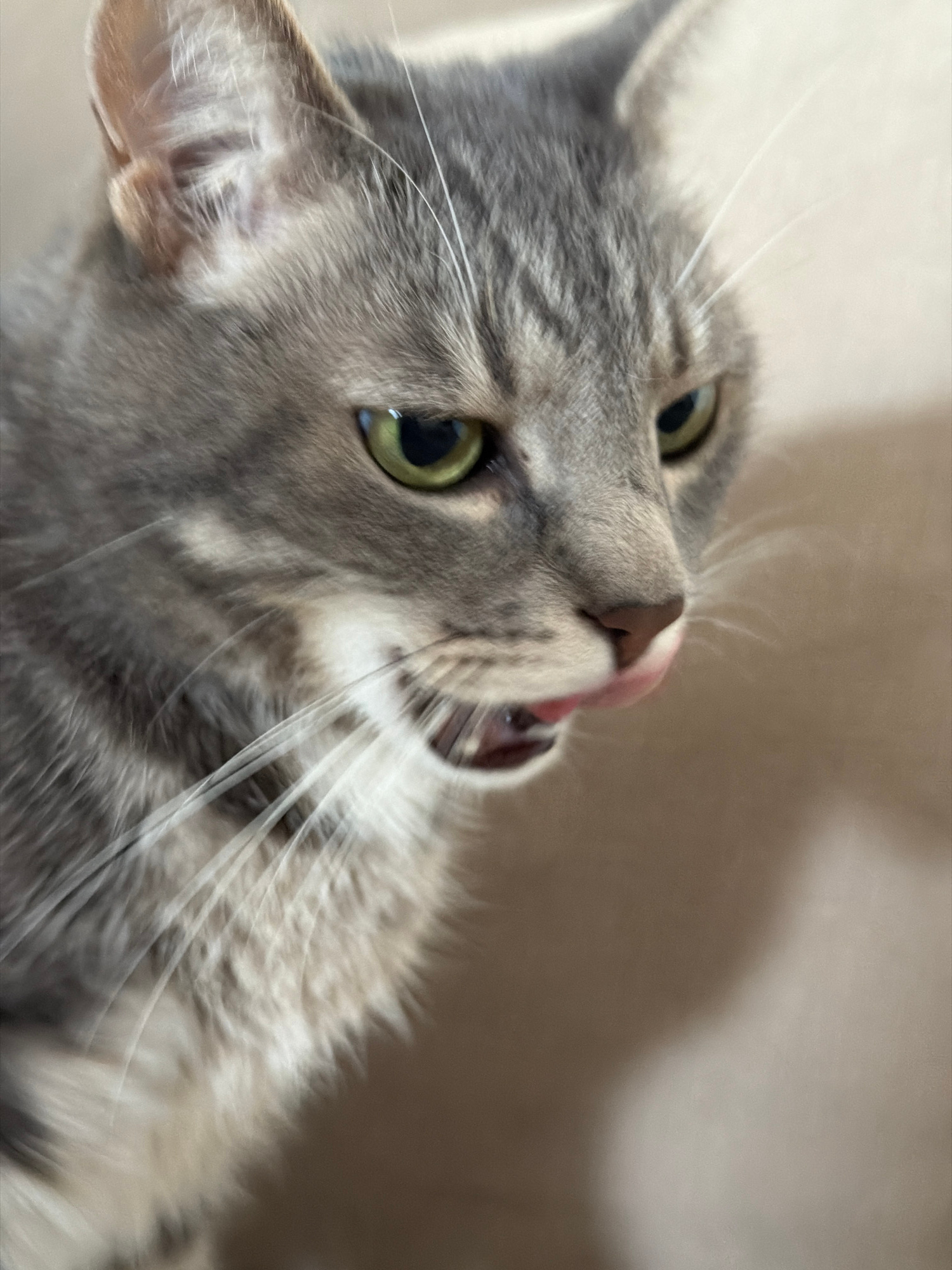 A close-up, angled shot features a grey tabby cat with green eyes, licking its nose with a pink tongue. The background is a blurry, neutral beige color. The cat's ear is visible on the left. The locat…read more
