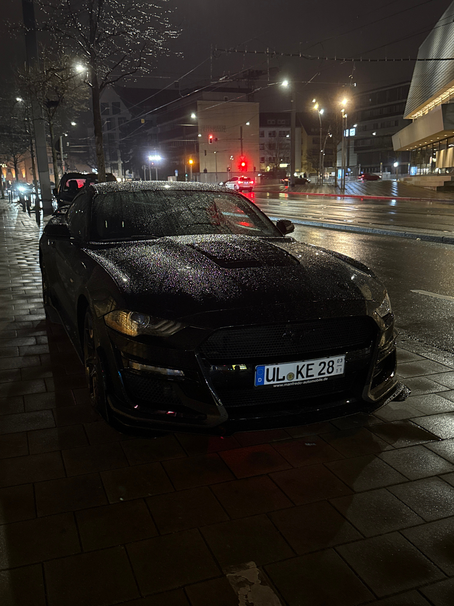 The image shows a black sports car parked on a wet, paved street in the city of Ulm, Germany. The car has a German license plate reading "UL KE 28". The car is parked on the right side of the road, ne…read more