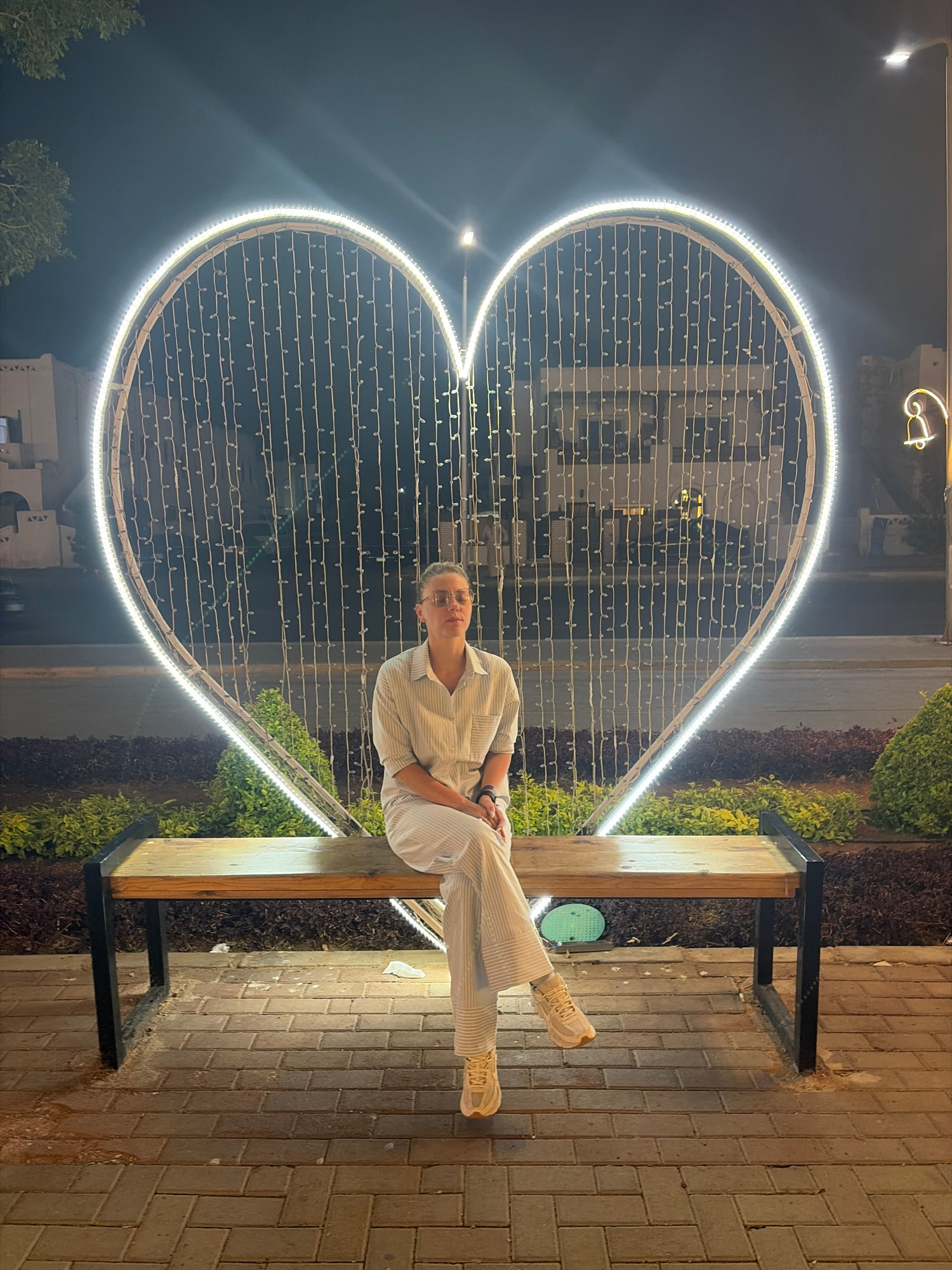 A woman wearing a light-striped outfit and tan sneakers sits on a wooden bench illuminated by string lights shaped into a large heart. The bench is situated on a brick walkway near green bushes and a…read more