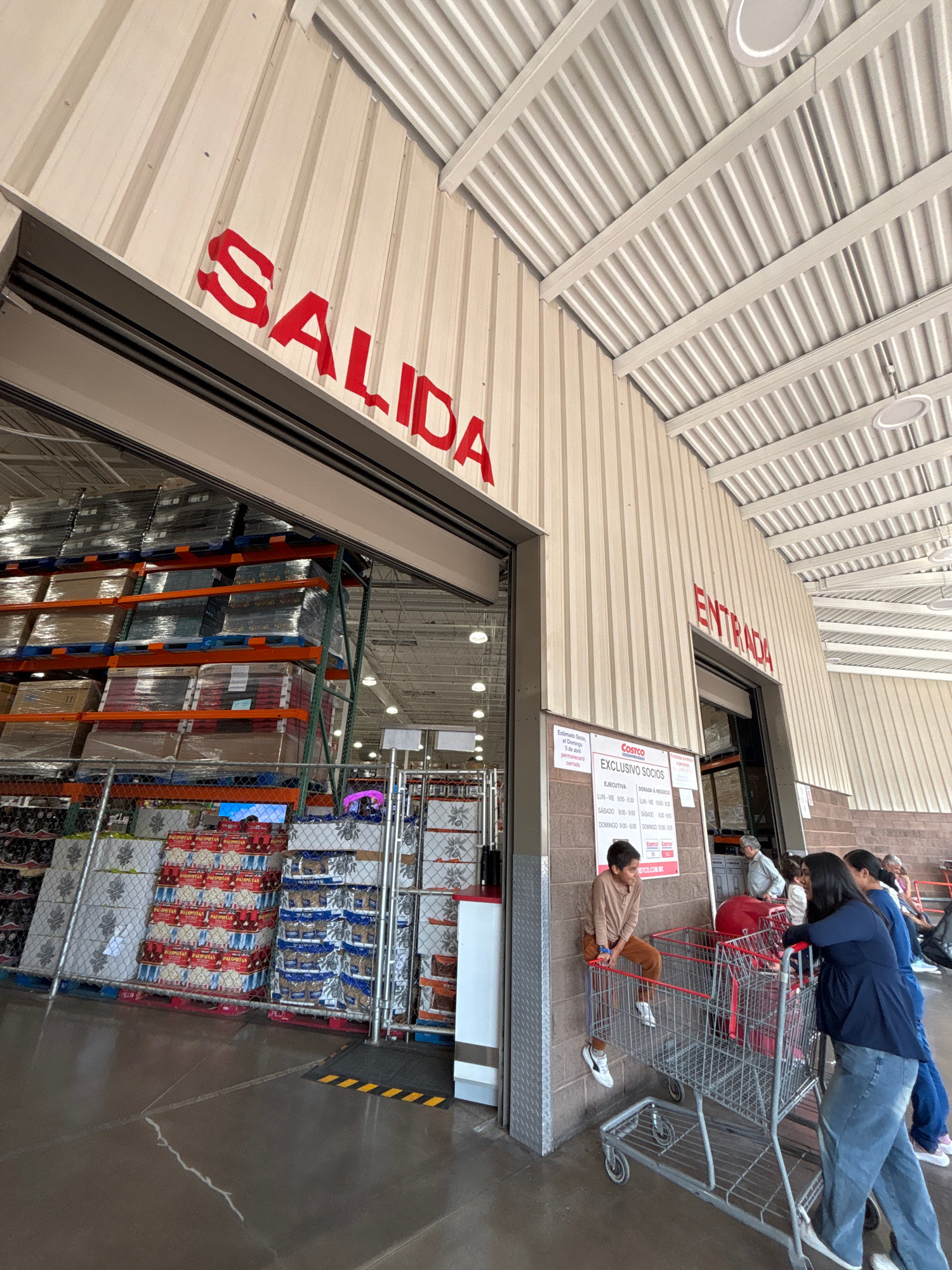 The image shows the entrance and exit of a Costco store in Puebla, Mexico. The entrance sign reads "ENTRADA" in Spanish, and the exit sign reads "SALIDA" in Spanish. People are seen at the entrance, s…read more