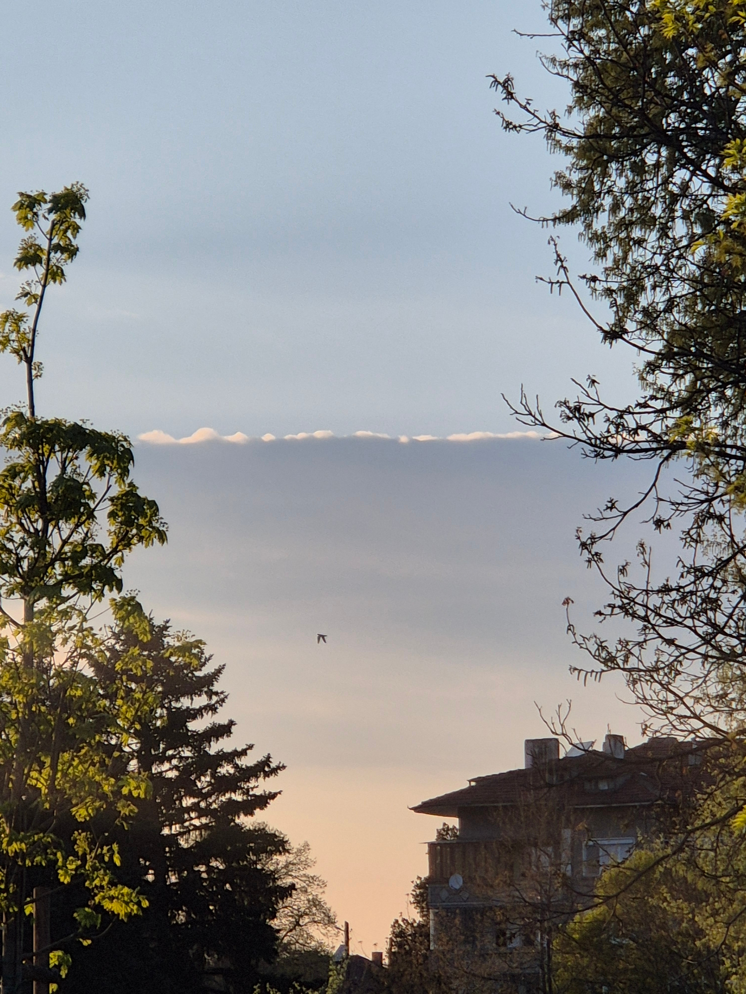 An eye-level outdoor shot of a sky during daytime. The frame is partially obstructed by tree branches and foliage. The sky is a mix of light blue and a light, peachy pink hue, possibly indicating suns…read more