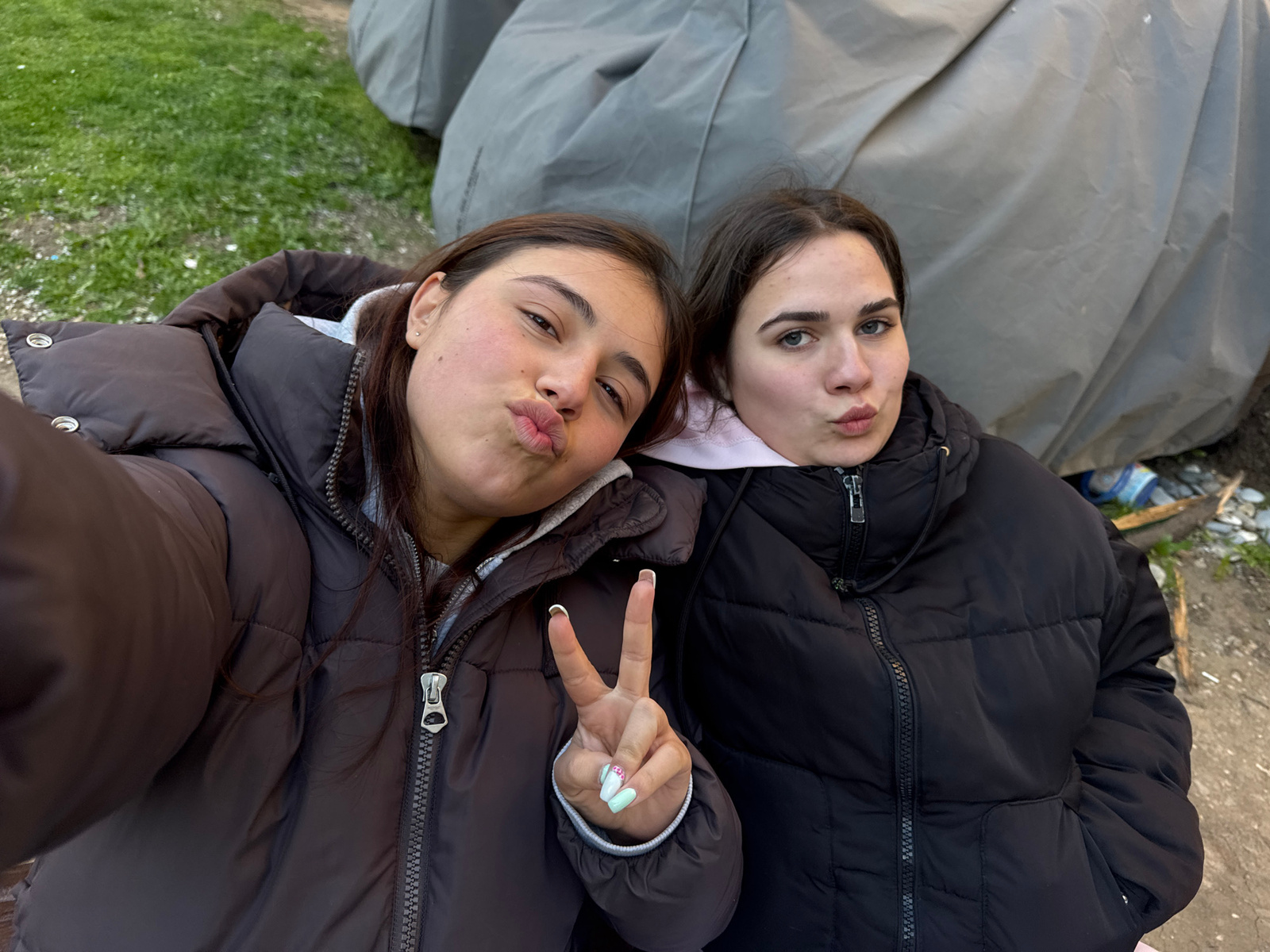 Two young women are posing for a selfie, lying on what appears to be a grey tarpaulin. The woman on the left has dark brown hair, fair skin, and is wearing a black puffer jacket. The woman on the righ…read more