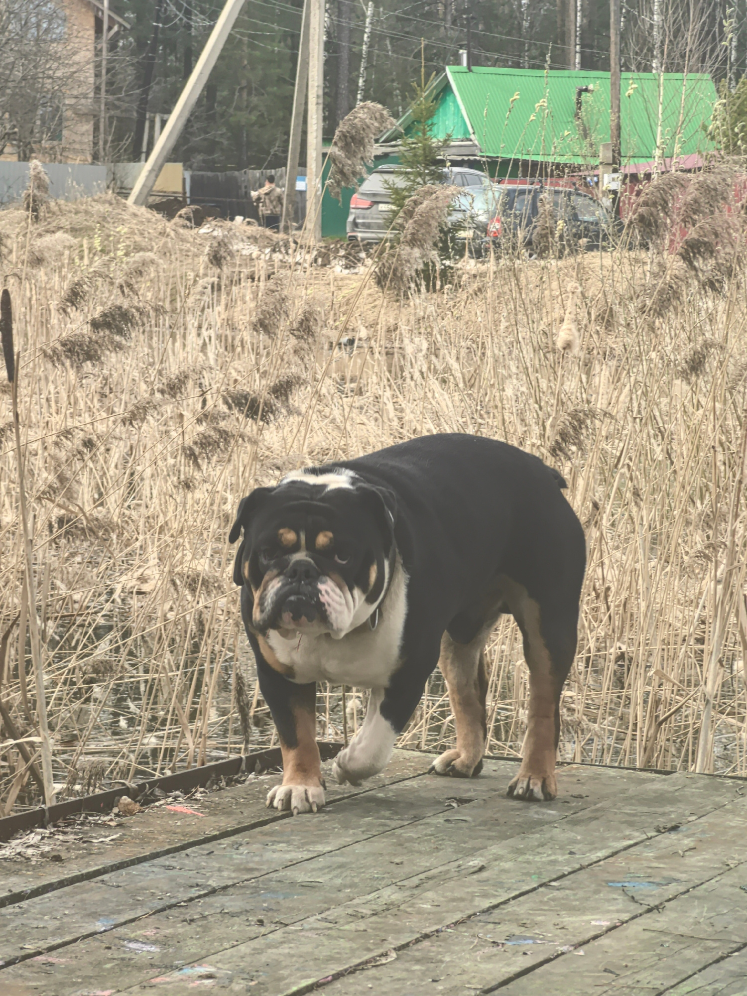 An English bulldog stands on a wooden platform. Behind the bulldog are tall, dry grasses. In the background are buildings, utility poles, and trees. Cars are parked near a green-roofed structure. The…read more