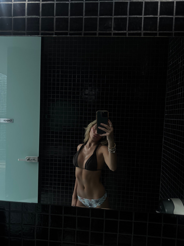 In a dark, tiled room, a blonde woman in a bikini takes a mirror selfie. She holds her phone up, wearing a black top and patterned bottoms. Her body is slightly angled, revealing her midriff. The mirr…read more
