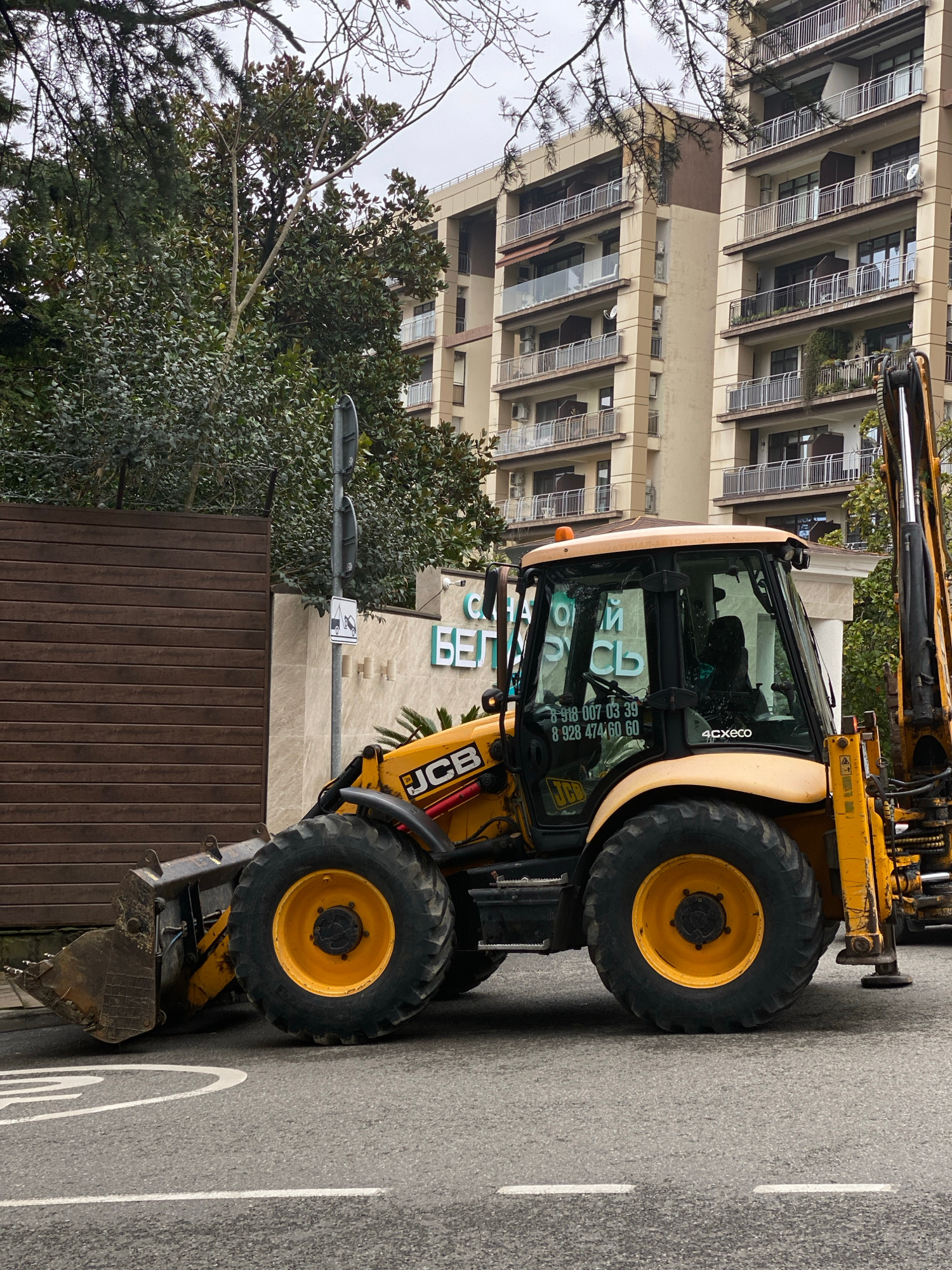 A yellow JCB 4CXECO backhoe loader is positioned on an asphalt road under an overcast sky. The vehicle faces slightly left, with its front loader bucket lowered to the pavement. A person is visible in…read more