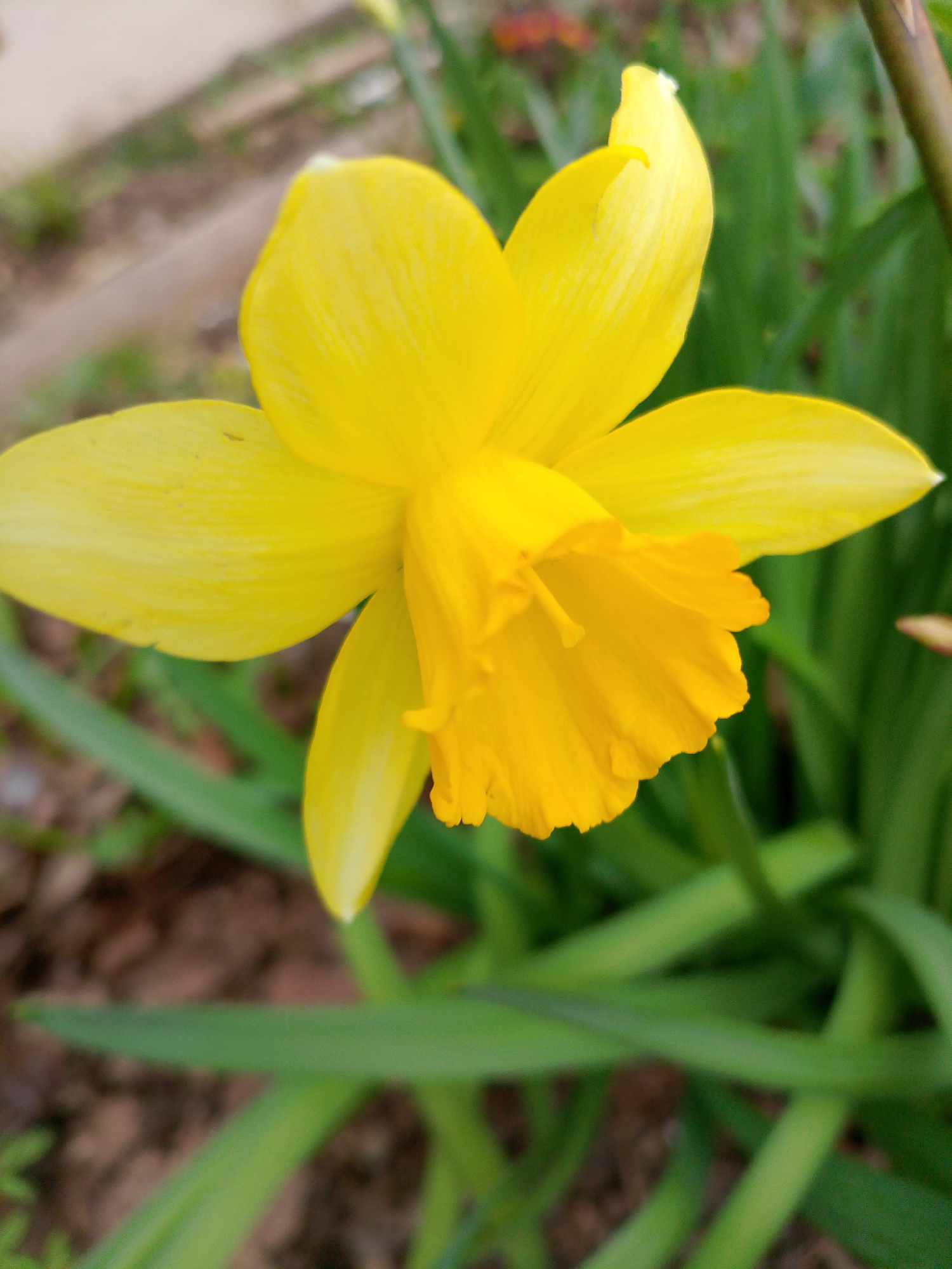 The image shows a close-up of a yellow daffodil in bloom. The flower has six petals arranged in a star shape and a central trumpet. The background consists of green leaves and blurred ground. There is…read more