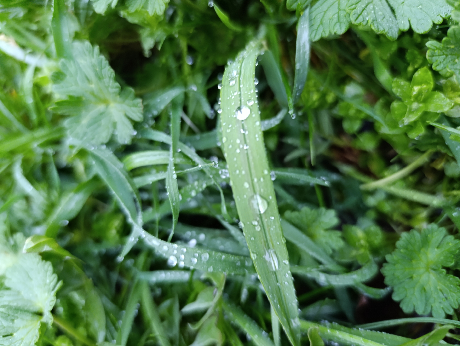 A close-up, outdoor shot of lush green vegetation. Dewdrops are visible on the blades of grass and the leaves of clover-like plants. The scene conveys a sense of freshness and natural beauty. There is…read more