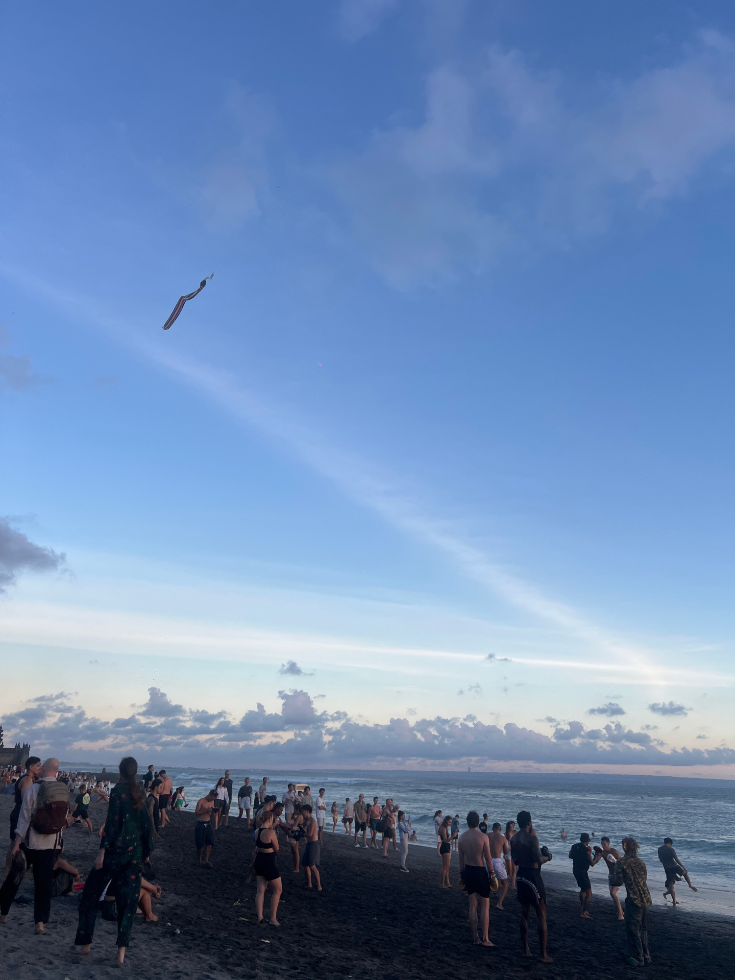 The image captures a wide beach scene in North Kuta, Indonesia. A large group of people stands near the water's edge, facing the ocean. Individuals appear to be in swimwear and casual attire. In the s…read more