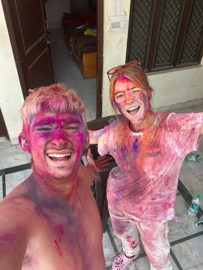Two individuals, a male and a female, are depicted covered in multi-colored powders, consistent with a Holi festival celebration, in what appears to be a residential outdoor or semi-outdoor area in Ri…read more