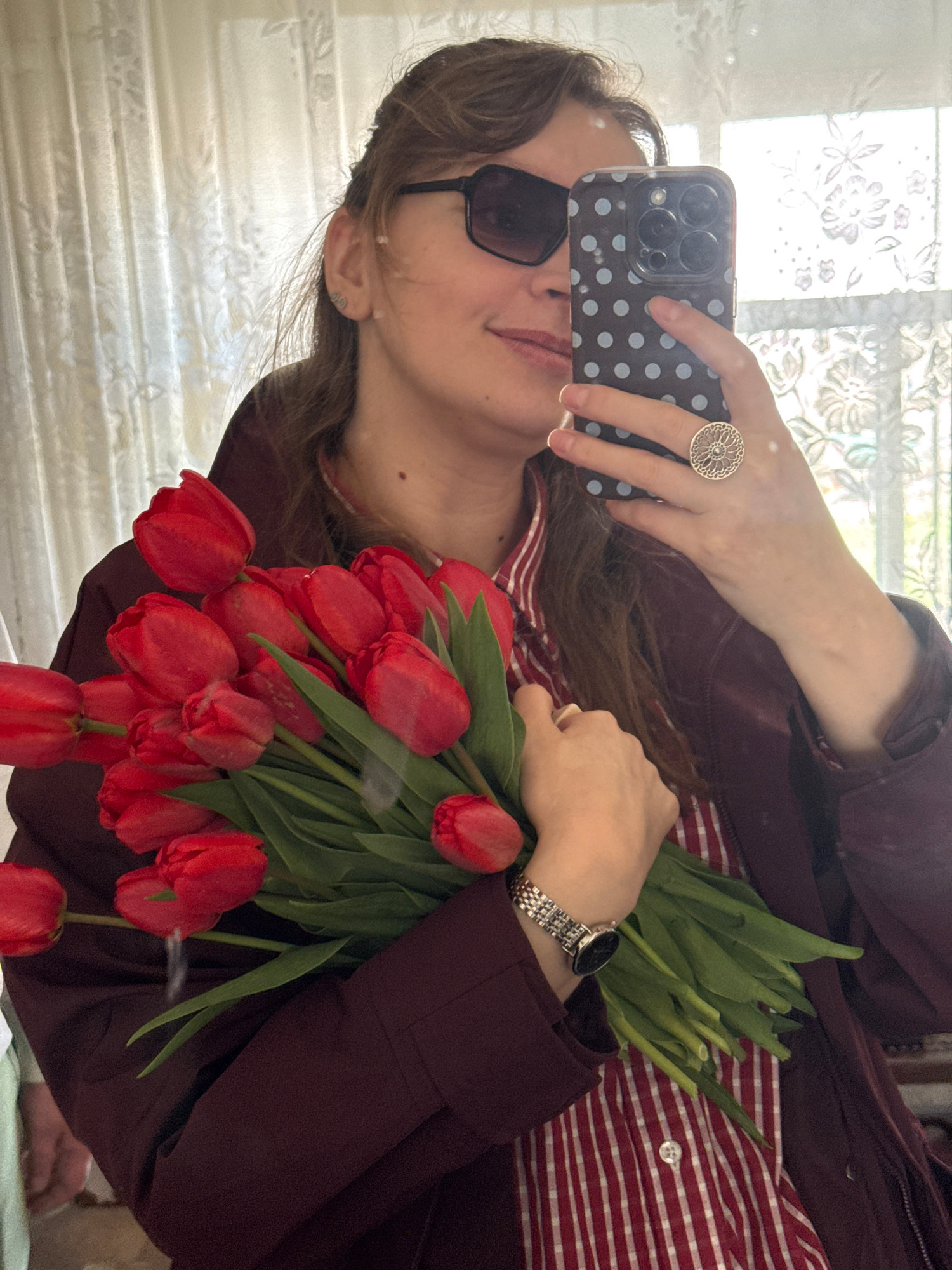 A mirror selfie captures a woman holding a large bouquet of red tulips in Aksay, Kazakhstan. The woman, whose face is partially obscured by sunglasses and her smartphone, appears to be smiling slightl…read more