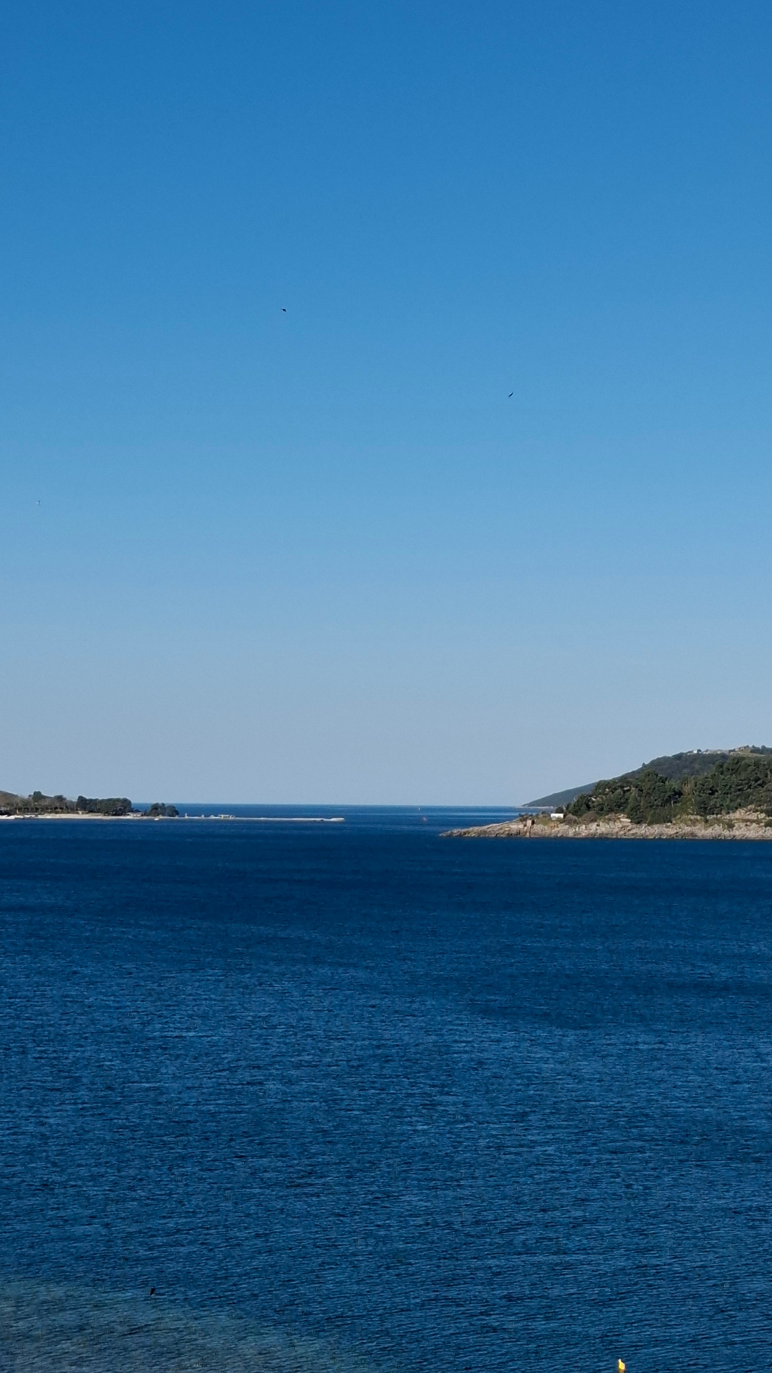 The image shows a vertical landscape with a gradient blue sky on the left and a dark blue sea on the right. A thin strip of land with green vegetation and some buildings runs along the right side, sep…read more