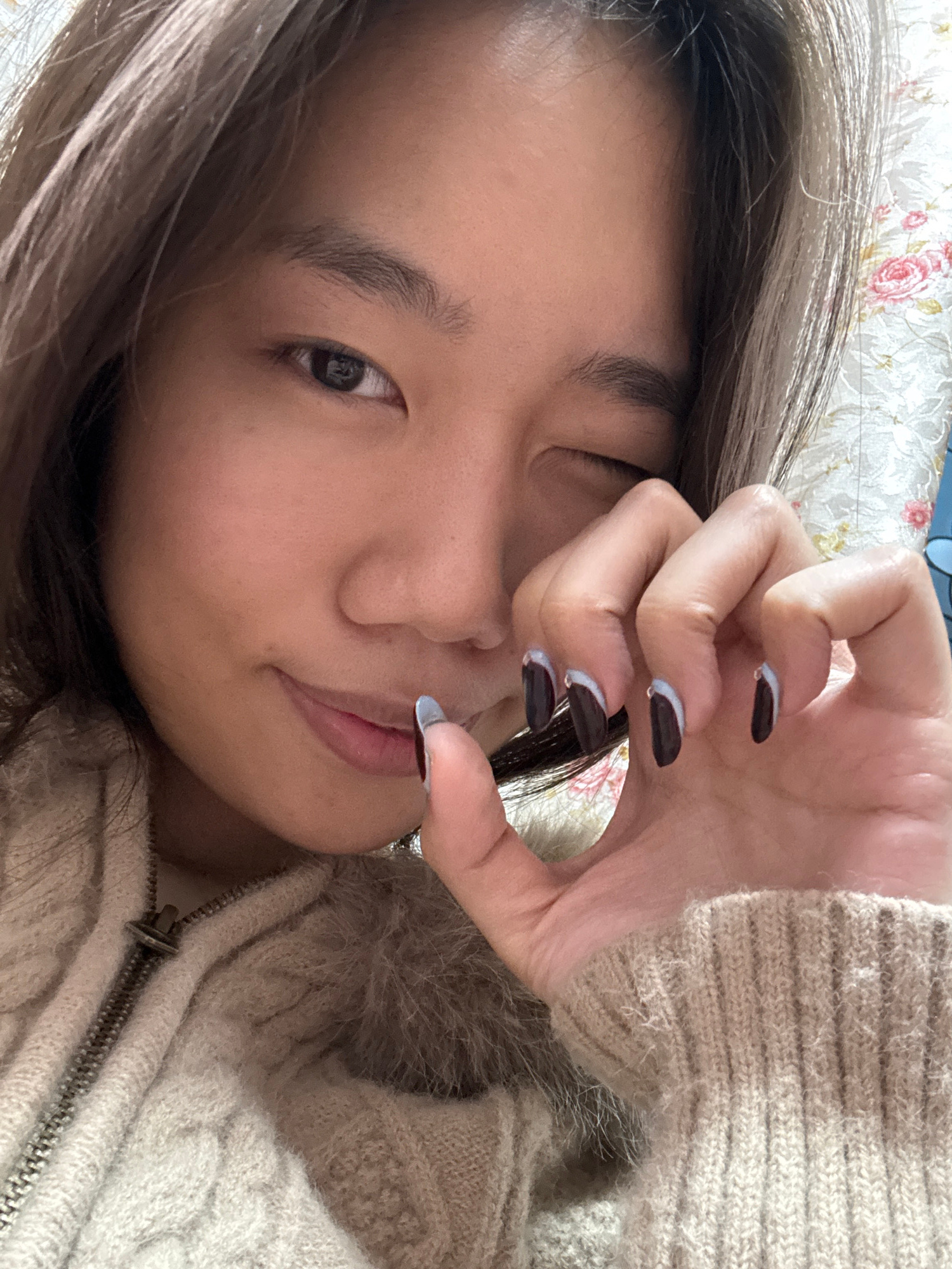 A close-up image displays a female individual, appearing to be of East Asian descent, located in Shapingba District, China. The subject's left eye is open, while her right eye is closed in a wink, acc…read more