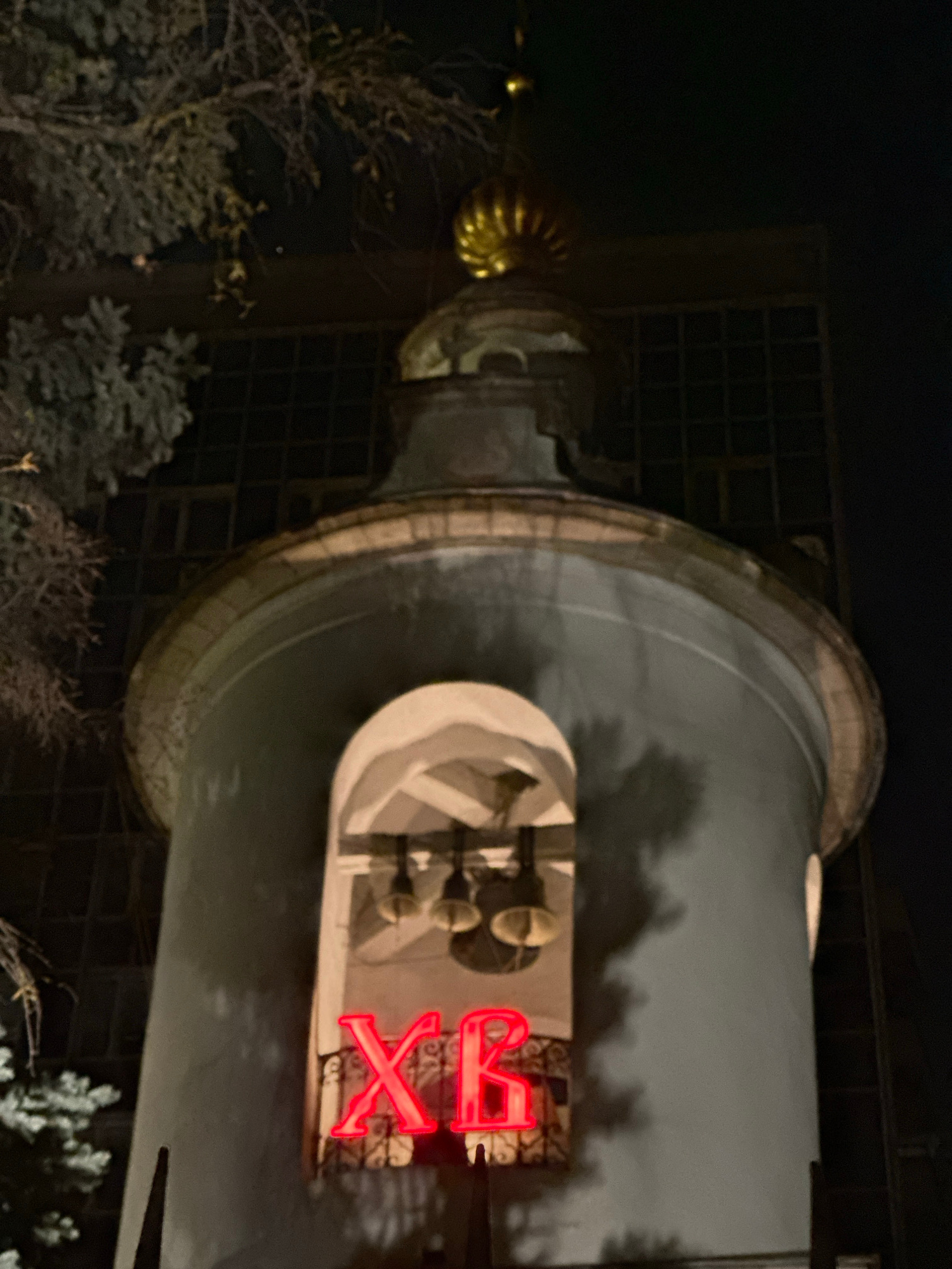 The image depicts the Danilov Monastery in Moscow, Russia, at night. A large cylindrical tower dominates the foreground, with a round dome-like structure and a golden onion dome visible on top. A red…read more