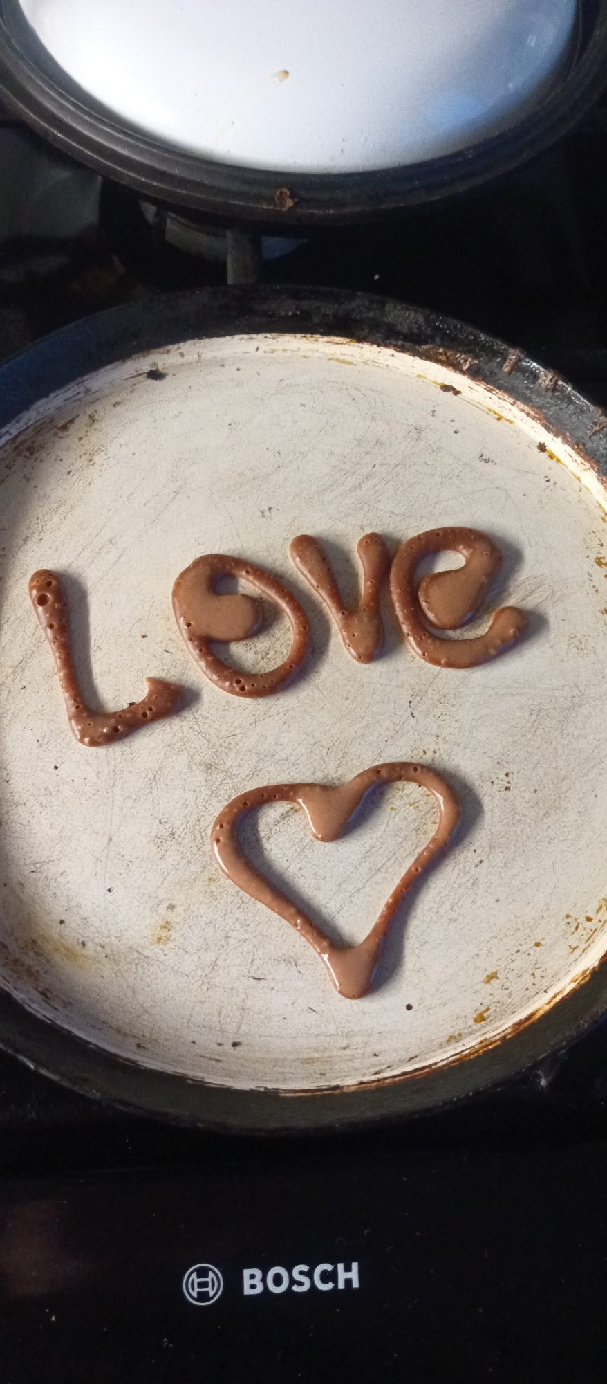 A high-angle shot depicts a white and slightly stained frying pan, containing the word "LOVE" spelled out in a brown, pancake-like batter, alongside a heart shape also formed from the same batter. The…read more