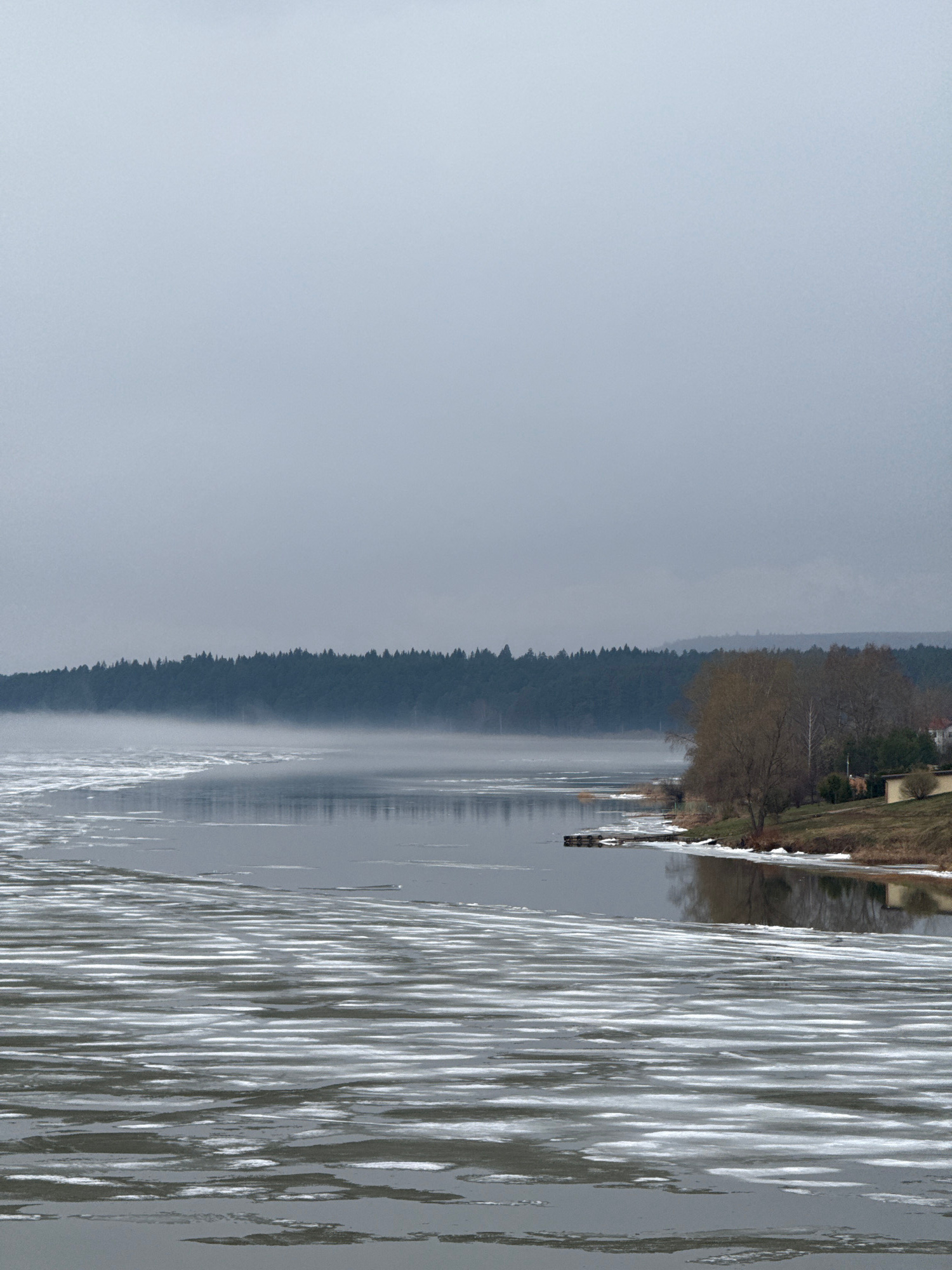 The image depicts a view of a body of water, likely a lake or river, under overcast skies. A dense forest lines the opposite shore, with hints of structures along the closer shoreline. The water's sur…read more