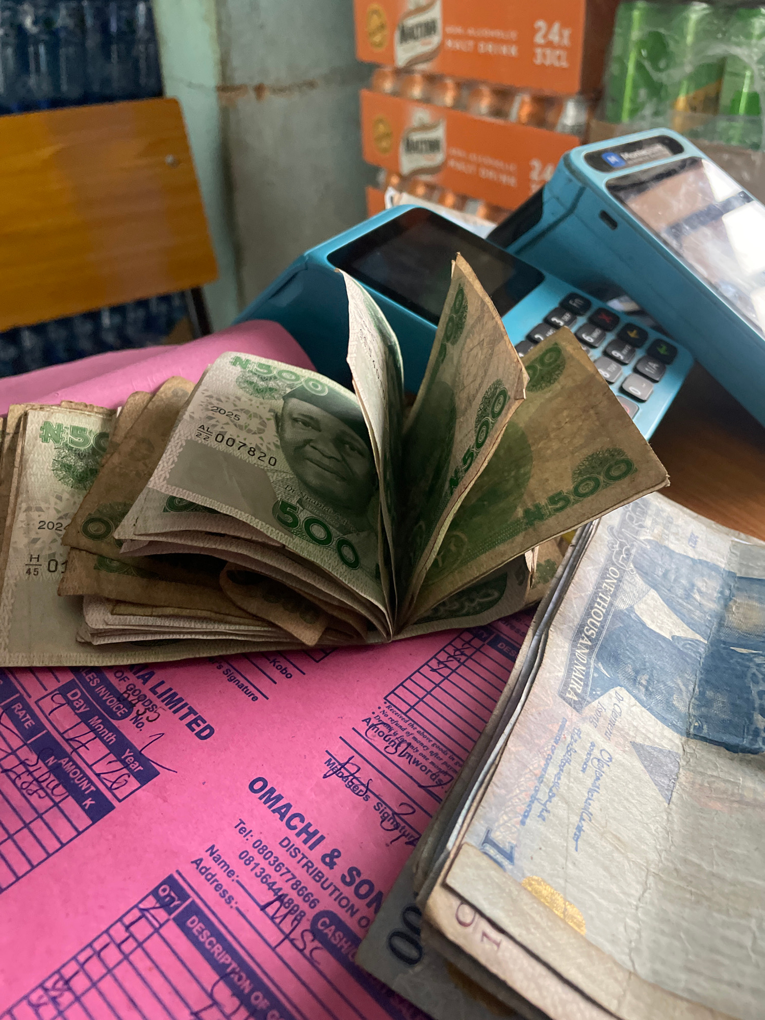 The image shows a close-up view of Nigerian currency (Naira) and business-related items. There are stacks of ₦500 and ₦1,000 Naira notes. The ₦500 notes are partially fanned out, revealing the portrai…read more