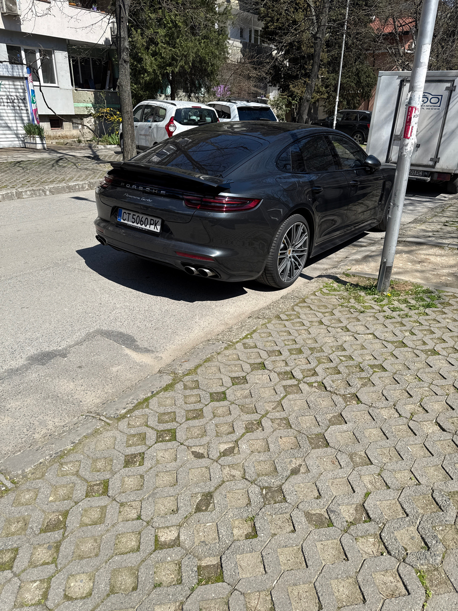The image depicts a black Porsche Panamera Turbo parked on a paved street adjacent to a sidewalk made of patterned concrete blocks. The car's rear end is visible, including its license plate which rea…read more