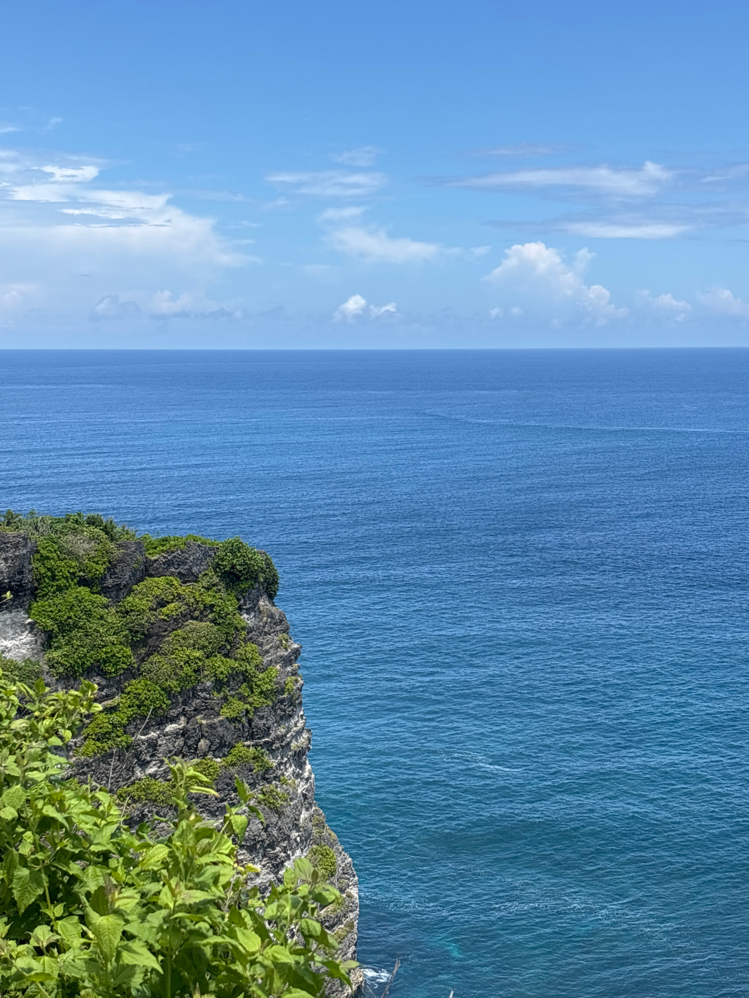 The image depicts a view from a cliff in Uluwatu, Indonesia. The primary elements are the sky, the ocean, and the cliff edge. The sky is blue with scattered white clouds. The ocean extends to the hori…read more