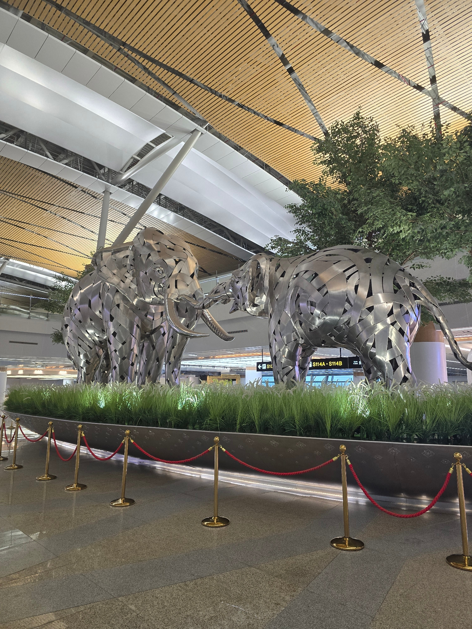 The image shows an indoor scene with two metal bull sculptures on a raised planter bed filled with green plants. The sculptures are constructed from interconnected metal strips, creating abstract formβ¦read more