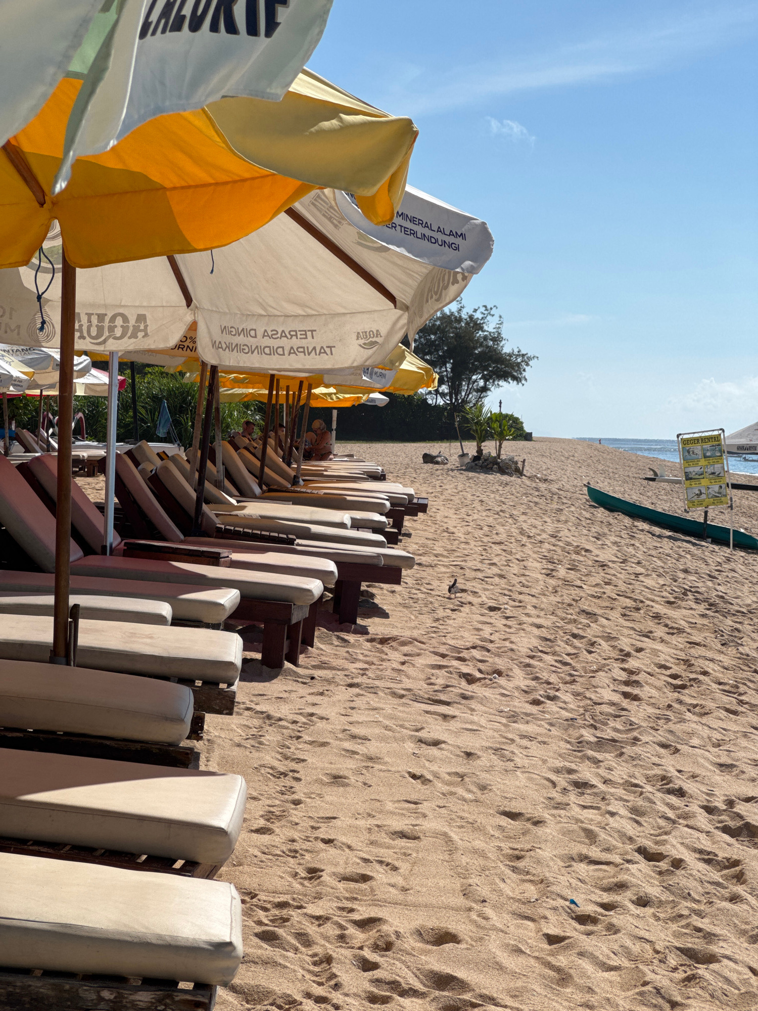 The image captures a sun-soaked scene at a beach in Unknown, Indonesia, where the warm-toned sand meets the blue of the sky. In the foreground, a row of lounge chairs, with weathered wooden frames and…read more