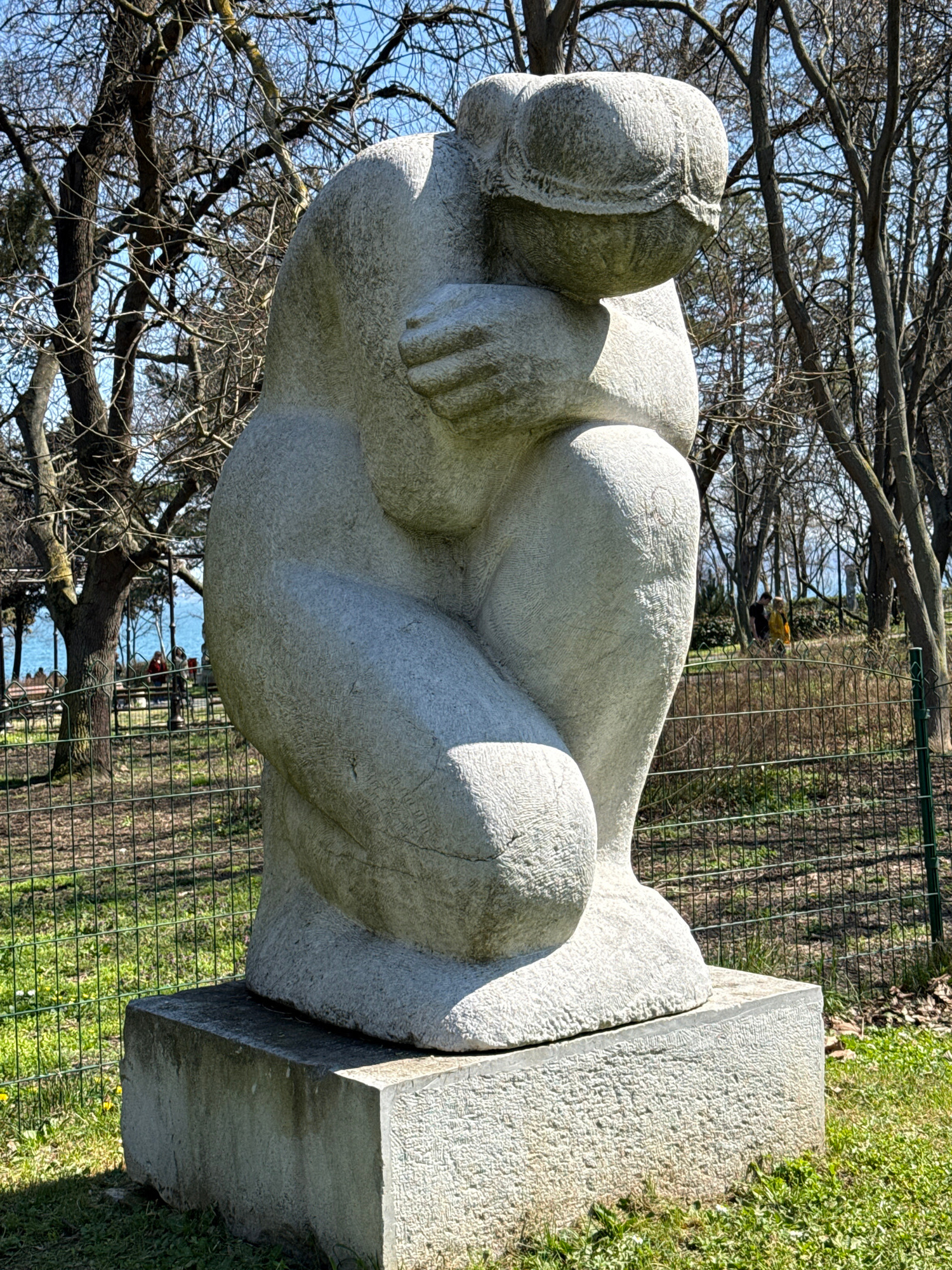 The image shows a stone sculpture of a seated figure, likely human, resting its head on its knees. The sculpture sits on a rectangular stone base. The statue is located outdoors, possibly in a park, a…read more