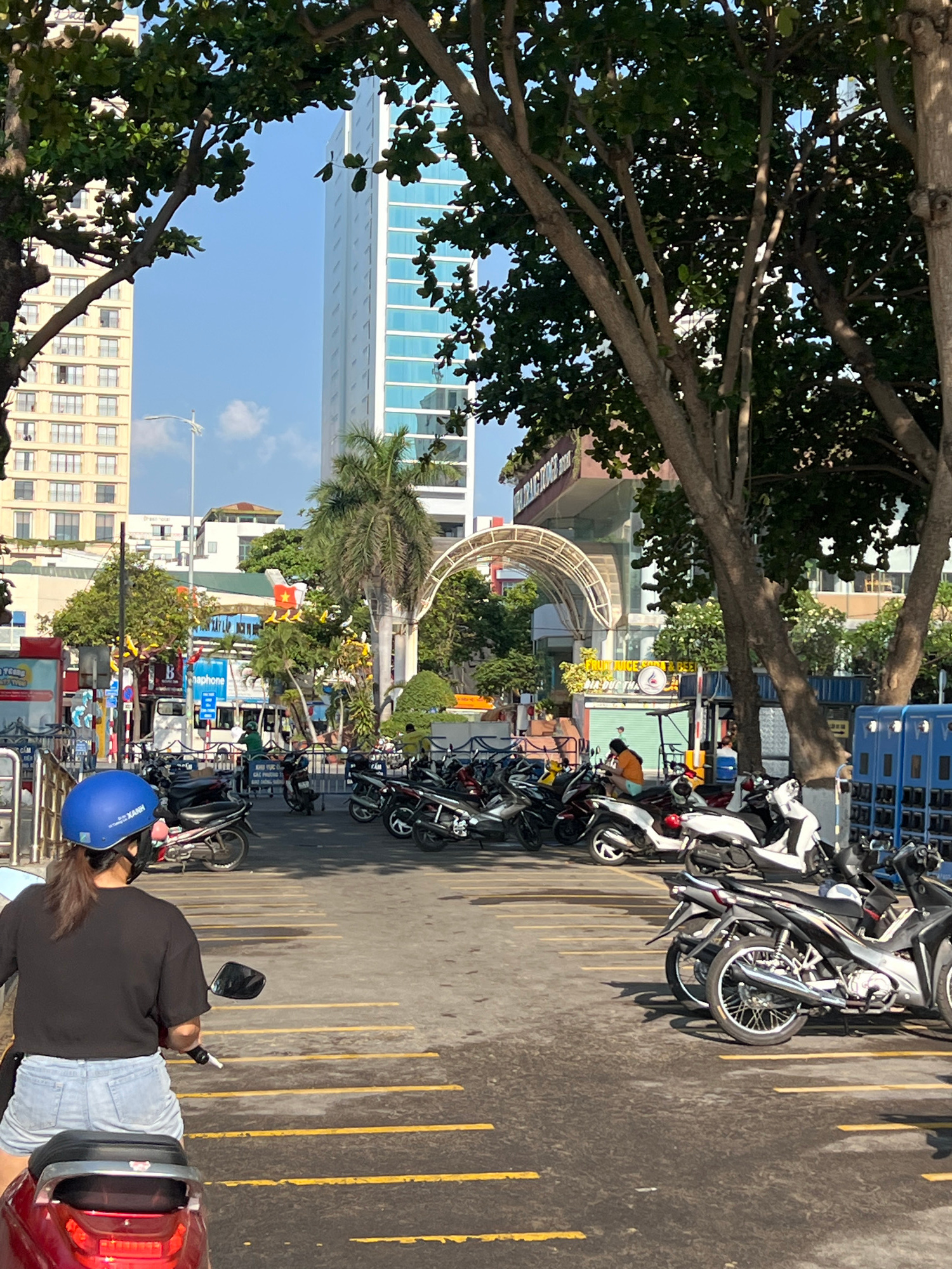 The image depicts a street scene in Nha Trang, Vietnam. A person wearing a blue helmet and a dark-colored sweater is sitting on a red motorbike, facing away from the camera. The motorbike is positione…read more