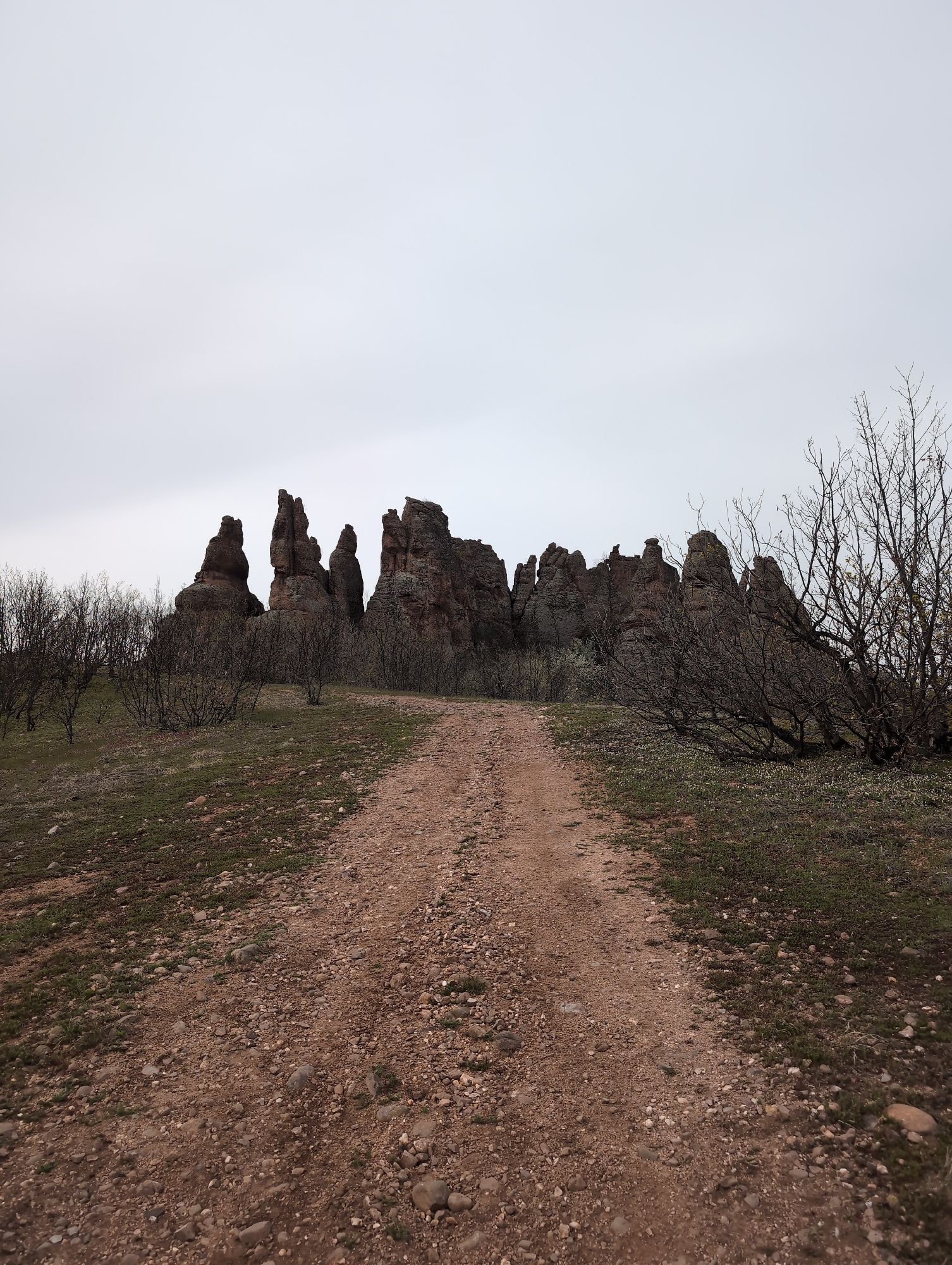 A landscape photograph taken in what appears to be a rural location near Chiflik, Bulgaria. A dirt path is seen in the foreground, leading towards a formation of unusual rock pillars. The path is bord…read more