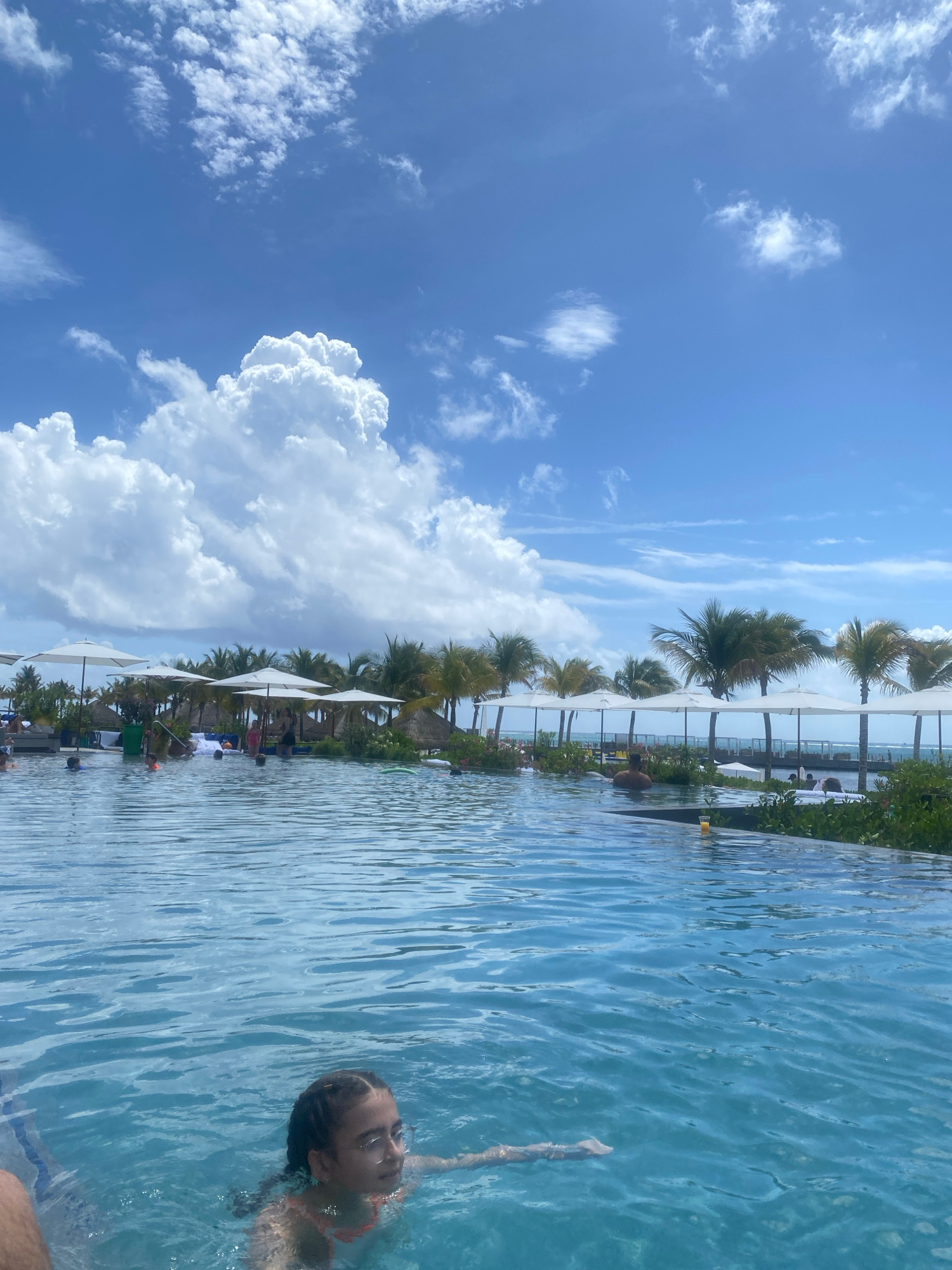 Here's a detailed description of the image: **Location:** Marina Maroma, Mexico. The image appears to be taken at a resort featuring an infinity pool. **Environment:** The sky is bright blue with la…read more