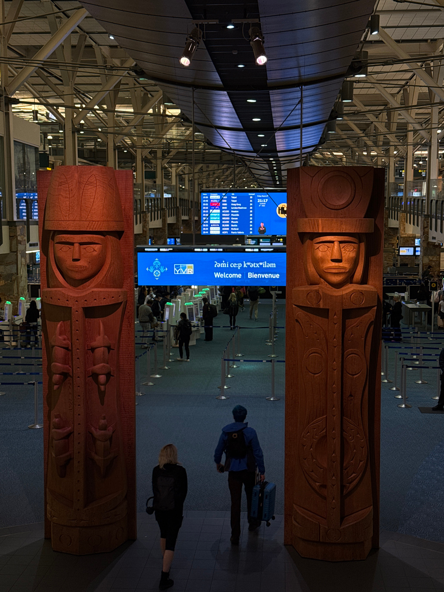 The image displays the interior of Vancouver International Airport (YVR) in Richmond, British Columbia, Canada. Two prominent, tall, dark reddish-brown wooden carved pillars stand in the foreground, f…read more