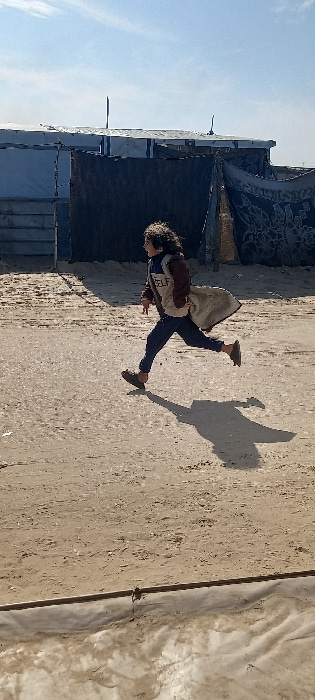 A single child is depicted running from left to right across a dirt path in Khan Yunis, Palestinian Territory. The child, with dark, curly hair, wears a brown jacket over a lighter garment that shows…read more
