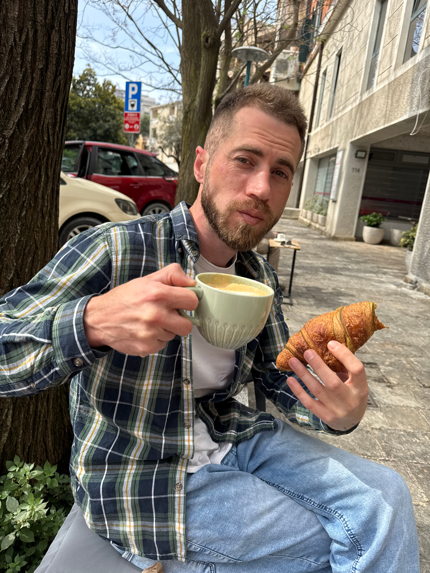 A man is seated outdoors, likely in a cafe or on a bench in Budva, Montenegro. He is holding a croissant in his right hand and a cup of coffee in his left. He is wearing a plaid shirt, a white t-shirt…read more