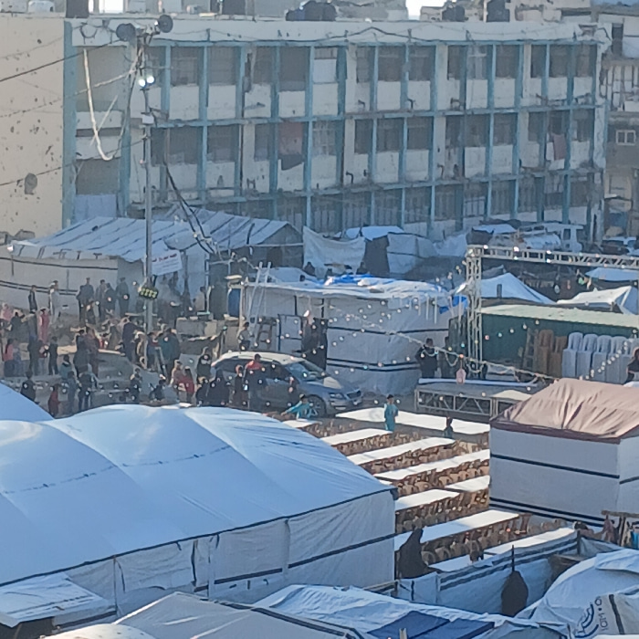 The image depicts an outdoor scene in the city of Gaza, Palestinian Territory, viewed from an elevated perspective. In the background, a multi-story building with a light-colored facade and blue horiz…read more