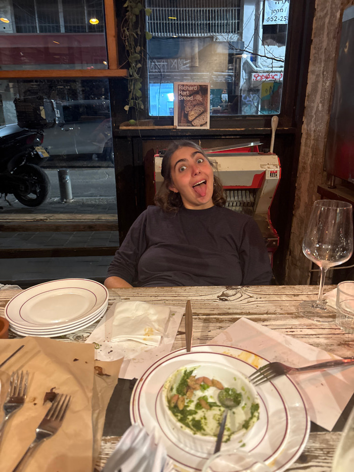 A person playfully sticks their tongue out next to a window displaying a "Richard Hart Bread" sign. The scene is at a restaurant, judging by the table setup with plates, forks, napkins, and wine glass…read more