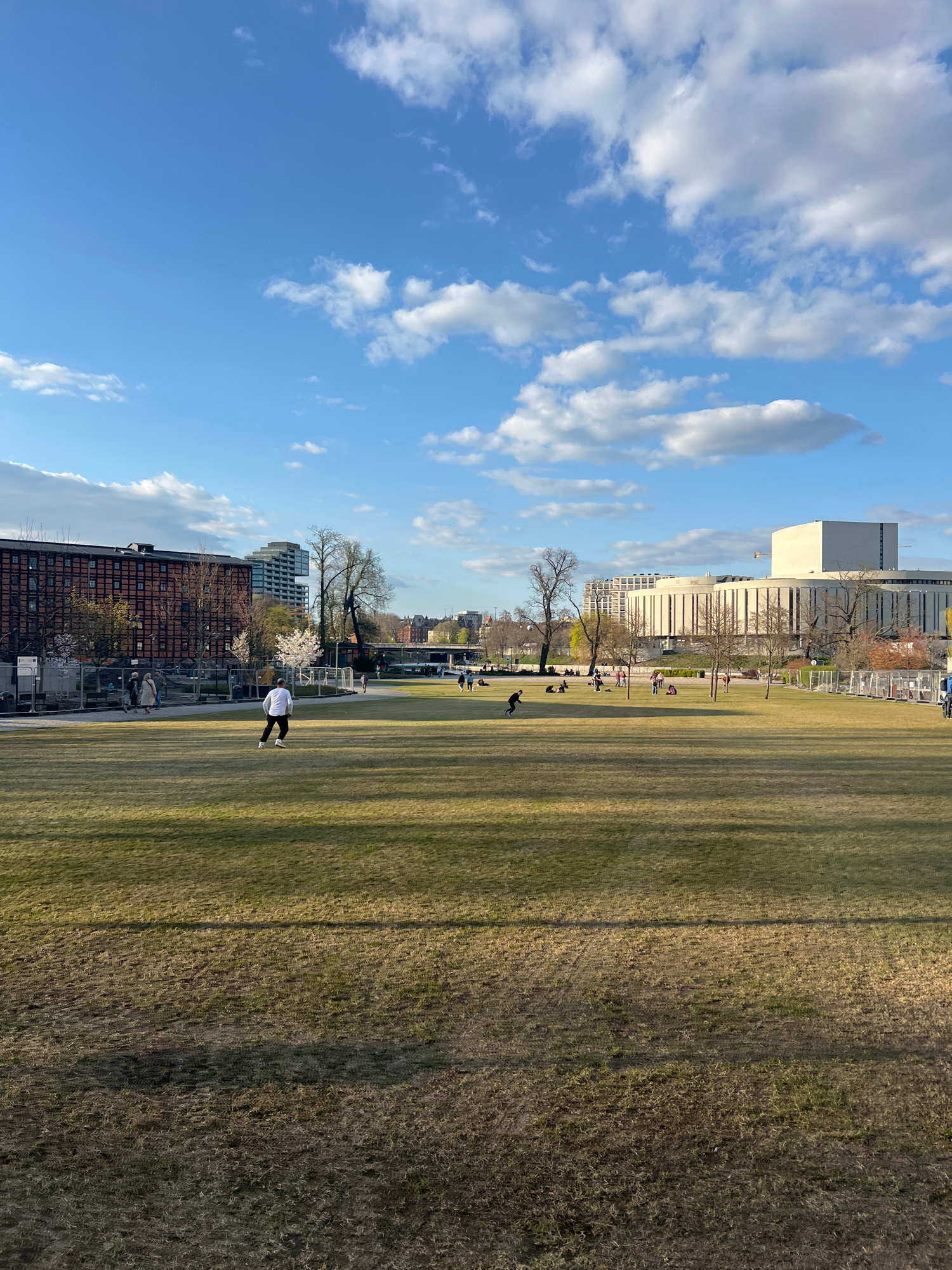 The image depicts a large grassy field in Bydgoszcz, Poland, with a clear blue sky and scattered white clouds above. Along the edge of the field are buildings, including a tall, modern building with a…read more