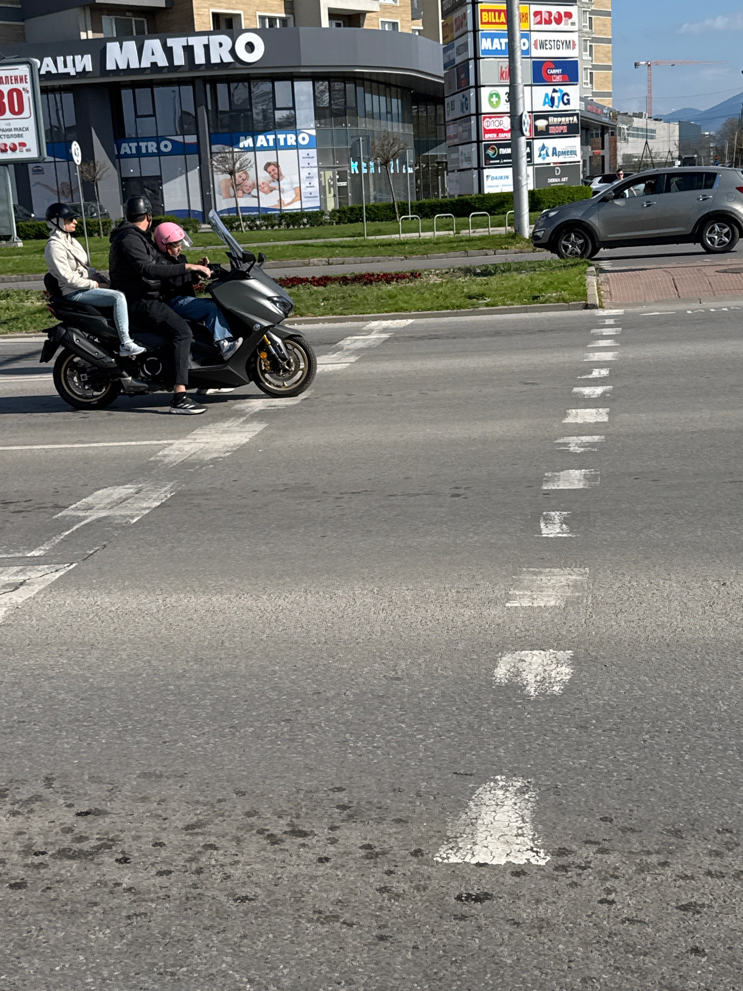 The image shows a street scene in Plovdiv, Bulgaria. A scooter with two riders, one wearing a pink helmet and the other wearing a white jacket, is stopped on the side of the road near a building with…read more