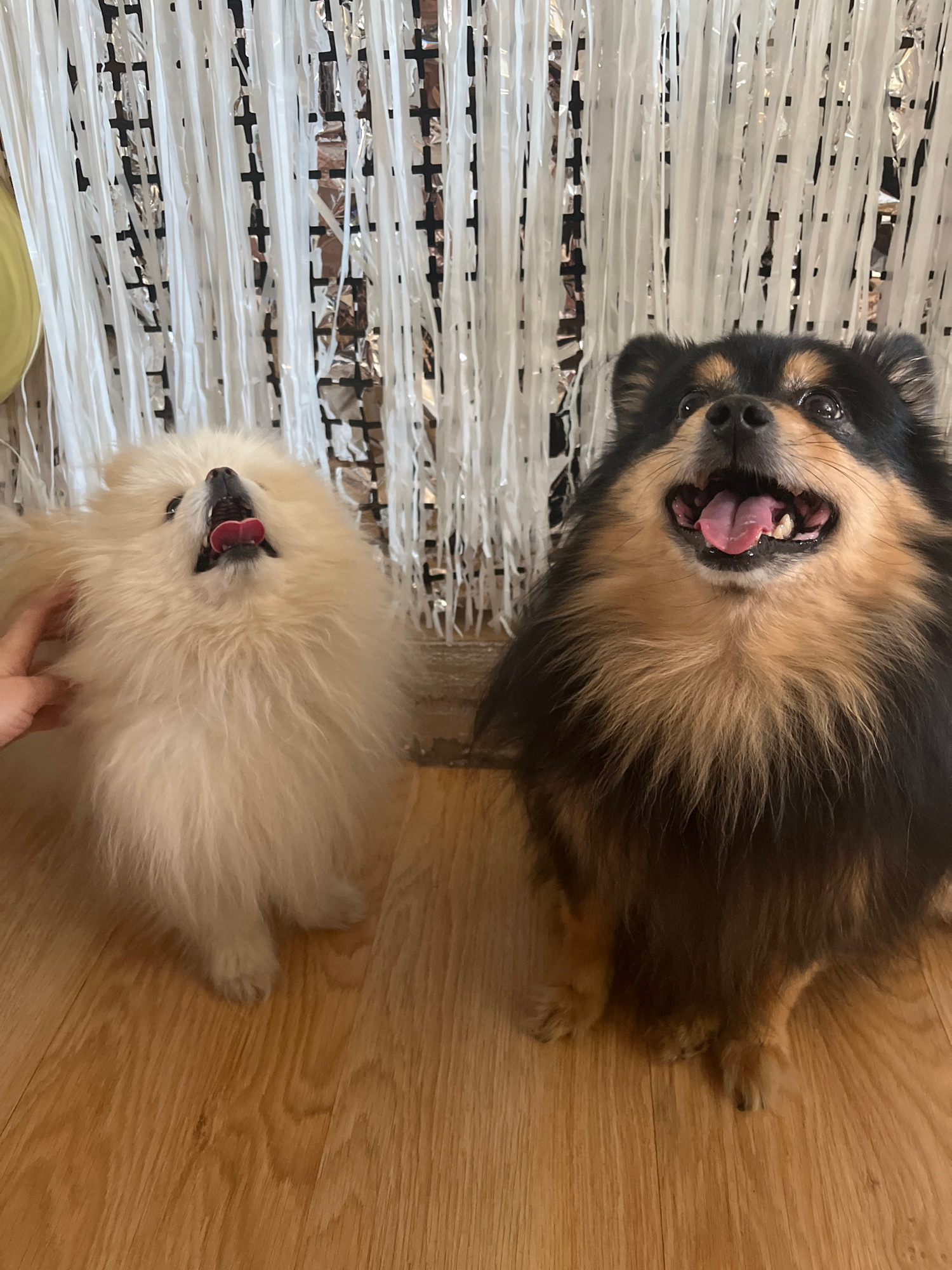 This indoor photograph, taken in Izhevsk, Russia, is rotated 90 degrees clockwise, depicting two small, fluffy dogs, likely Pomeranians, and a human hand. Towards the top of the rotated frame is a bl…read more