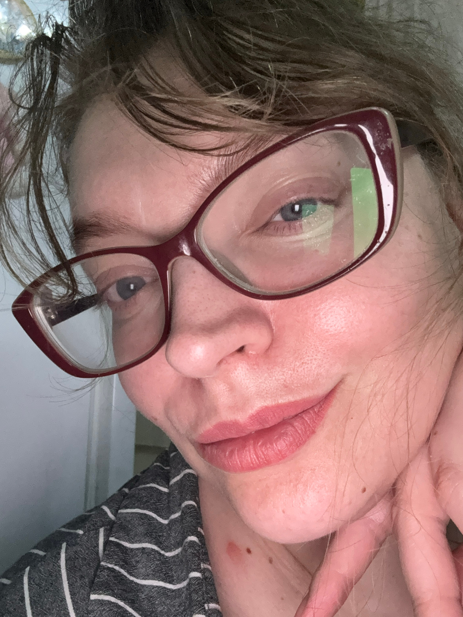 A close-up, angled shot captures a person, likely female, with light skin and reddish-brown hair, wearing maroon-framed eyeglasses. The image is taken from a low perspective, suggesting the individual…read more