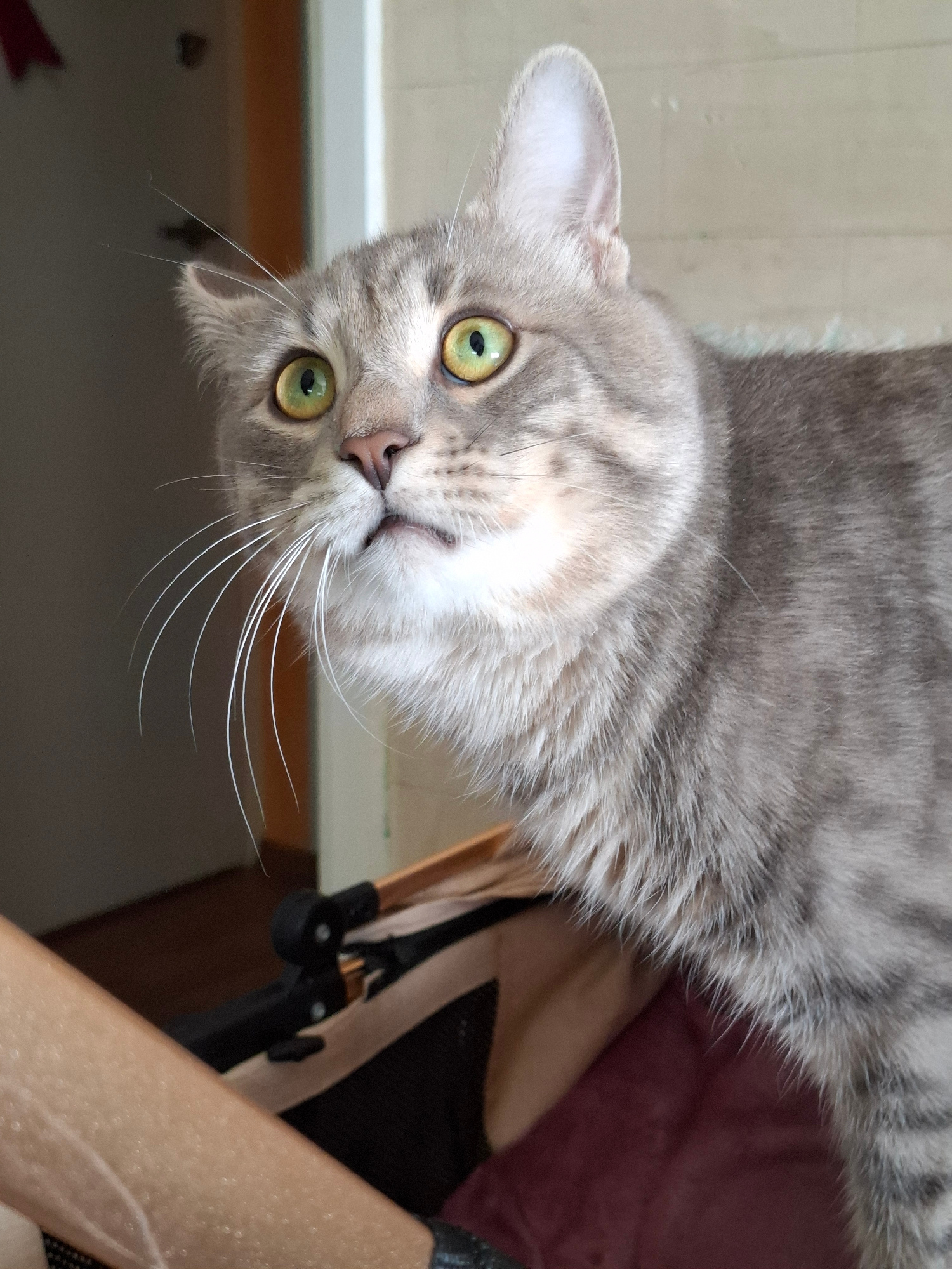 A curious cat with striking green eyes is captured in a close-up, headshot-style portrait, looking directly at the viewer. The cat has light grey and white striped fur, characteristic of a tabby, with…read more